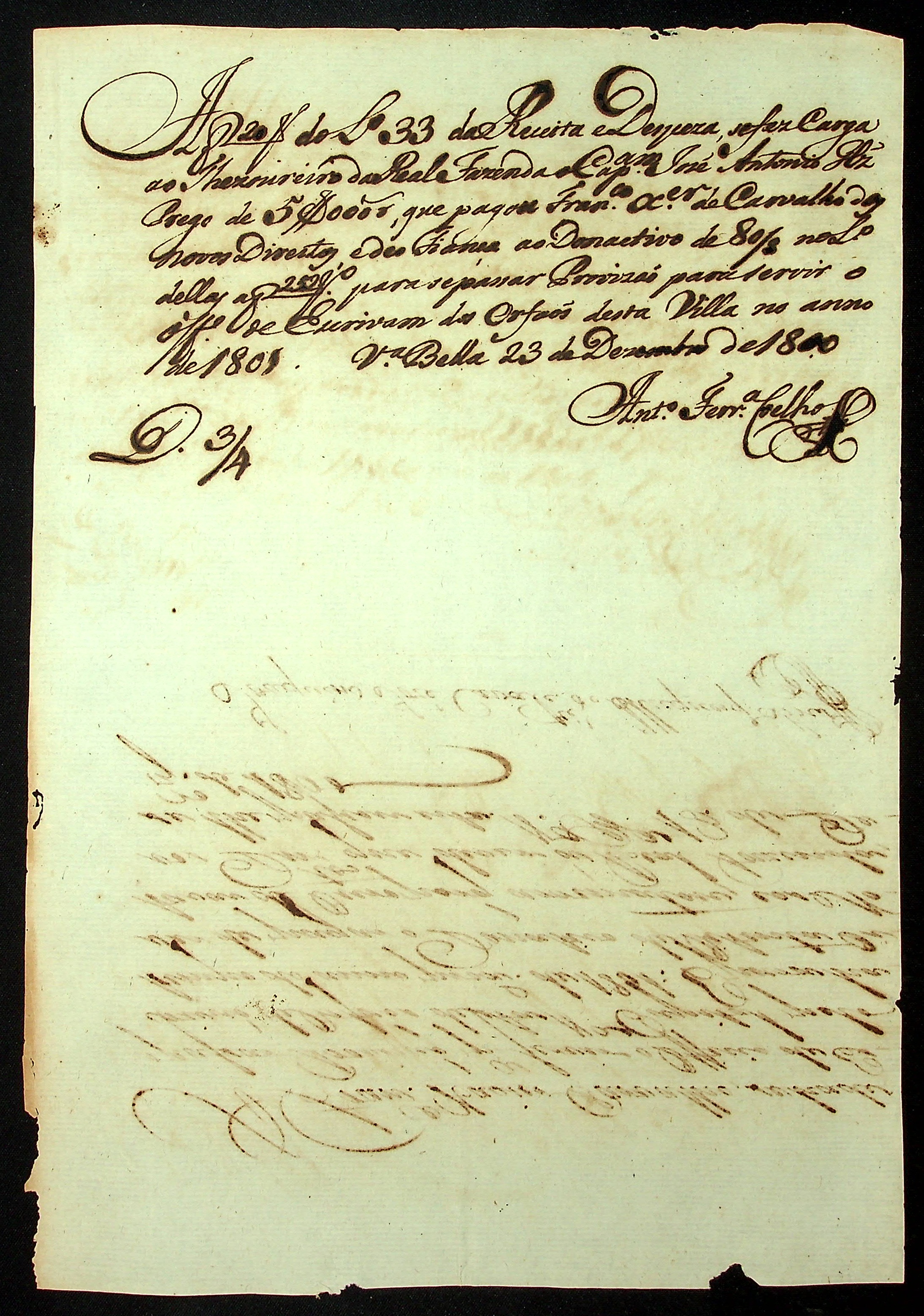 NOTIFICAÇÃO feita pelo [Secretário de Governo] Joaquim José Cavalcante de Albuquerque Lins á Francisco Xavier Carvalho para pagamento de novos direitos e assim receber provisão para servir o ofício de escrivão de Órfãos de [Vila Bela].