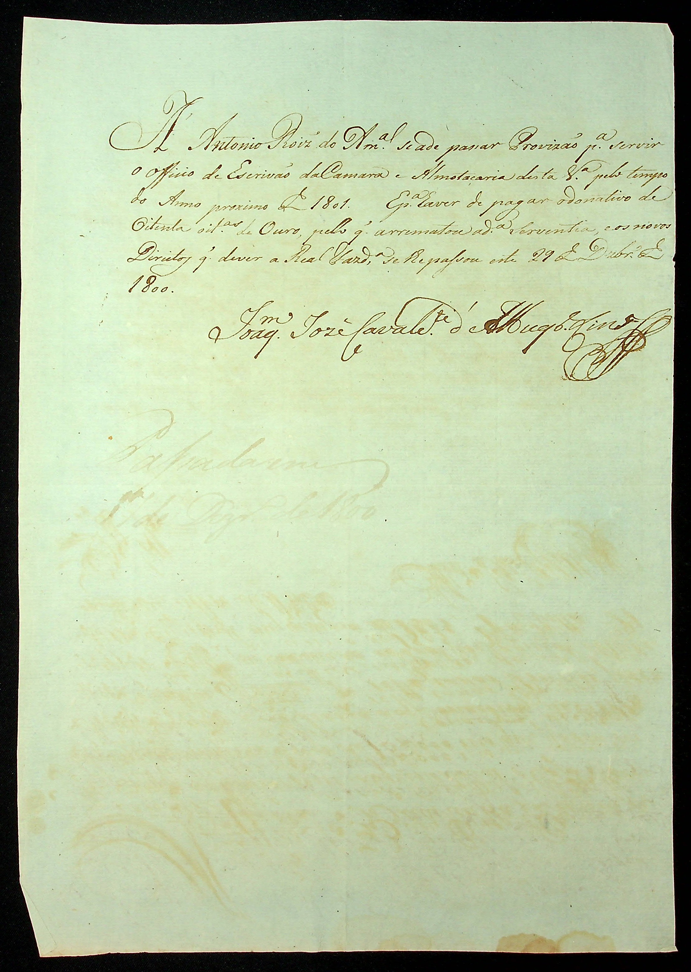 NOTIFICAÇÃO feita pelo [Secretário de Governo] Joaquim José Cavalcante de Albuquerque Lins á Antônio Rodrigues do Amaral para pagamento de novos direitos e assim receber Provisão para servir o Ofício de escrivão da Câmara e Almotaçaria de [Vila Bela].