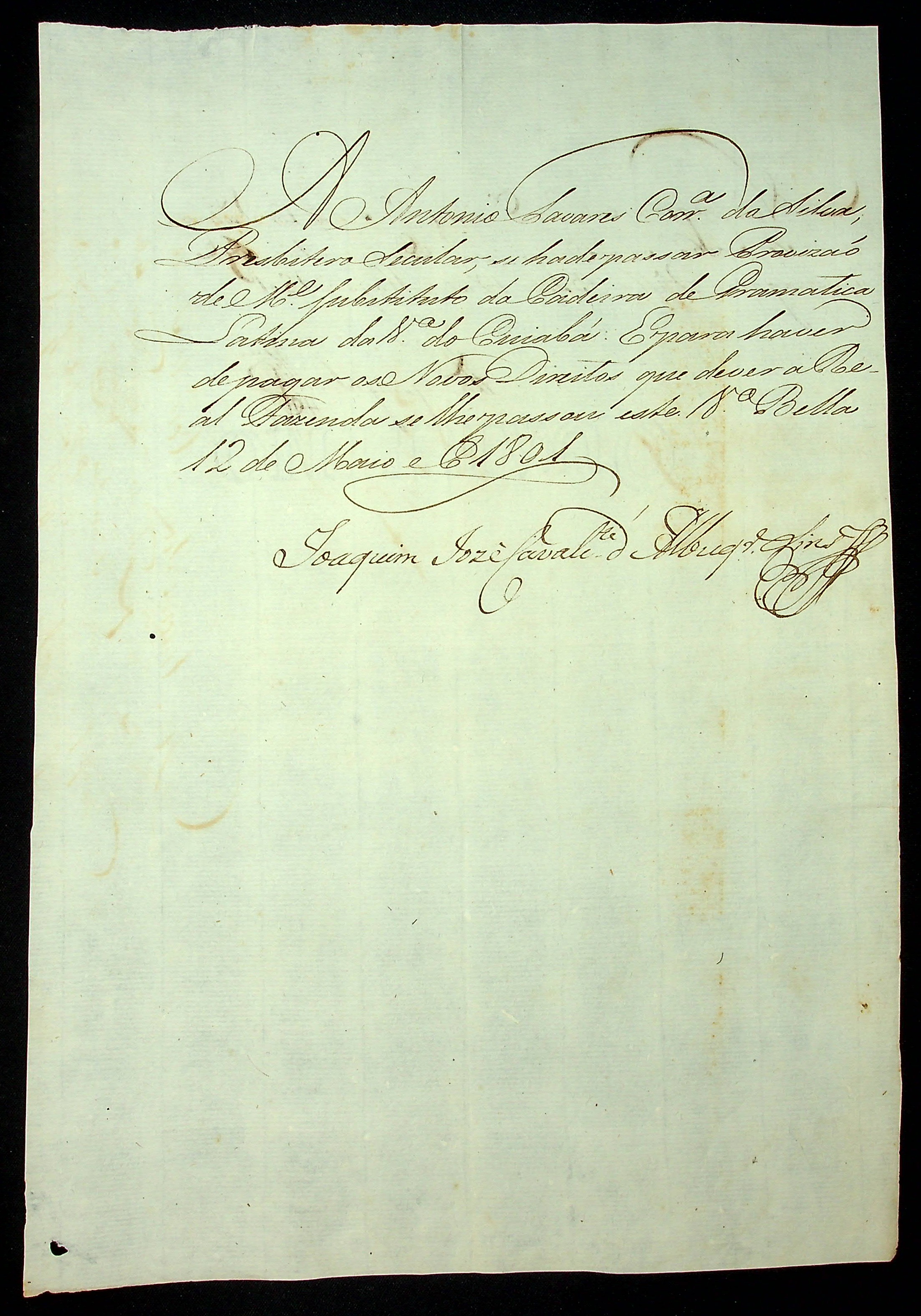 NOTIFICAÇÃO do [Secretário de Governo] Joaquim José Cavalcante de Albuquerque Lins à Antônio Soares Correa da Silva para pagamento dos novos direitos e receber a provisão de mestre substituto da Cadeira de Gramática Latina.