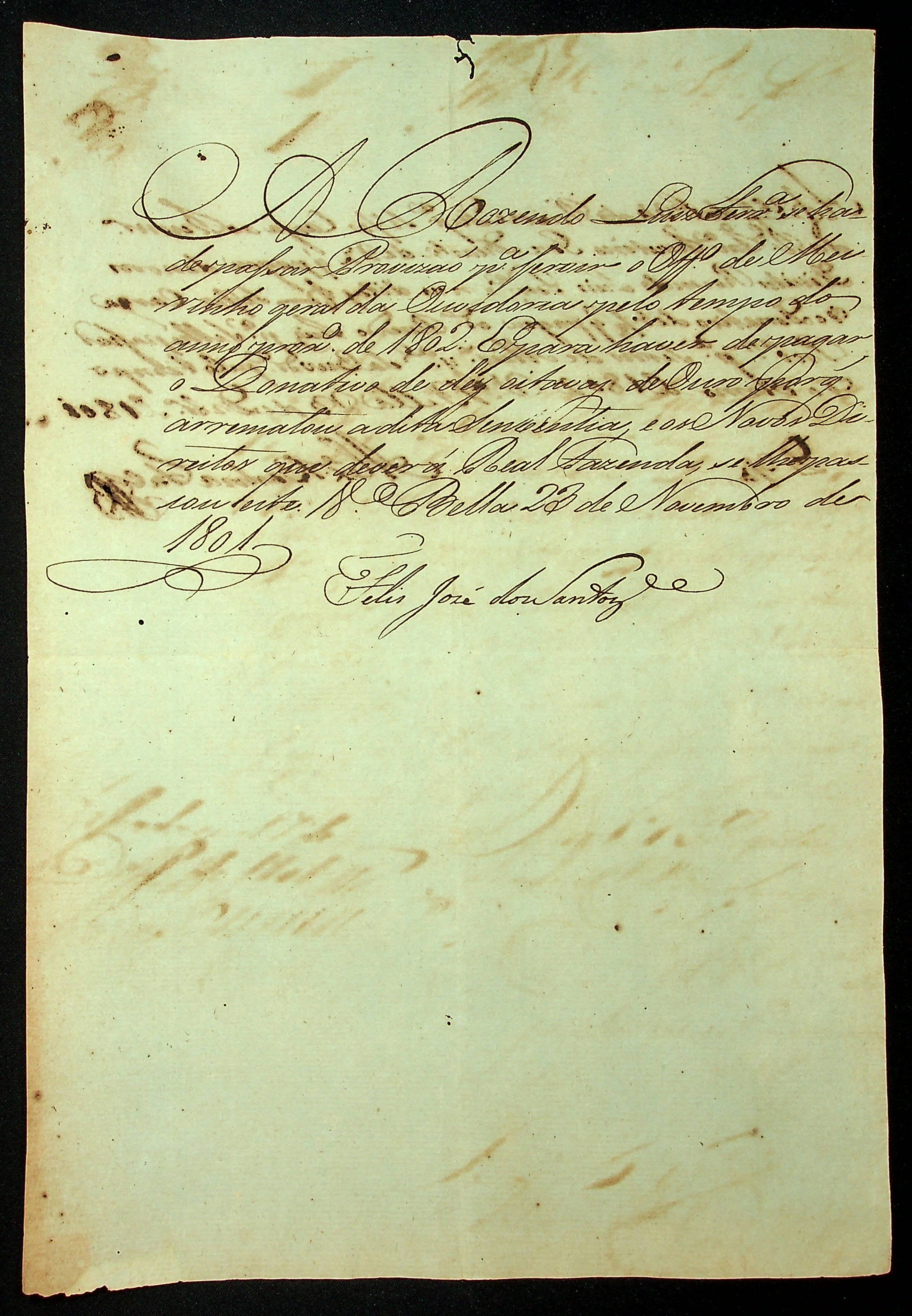NOTIFICAÇÃO do [Secretário do Governo] Félix José dos Santos à Rosendo Luís Ferreira para pagamento dos novos direitos e receber a provisão para exercer ofício de meirinho geral da Ouvidoria.