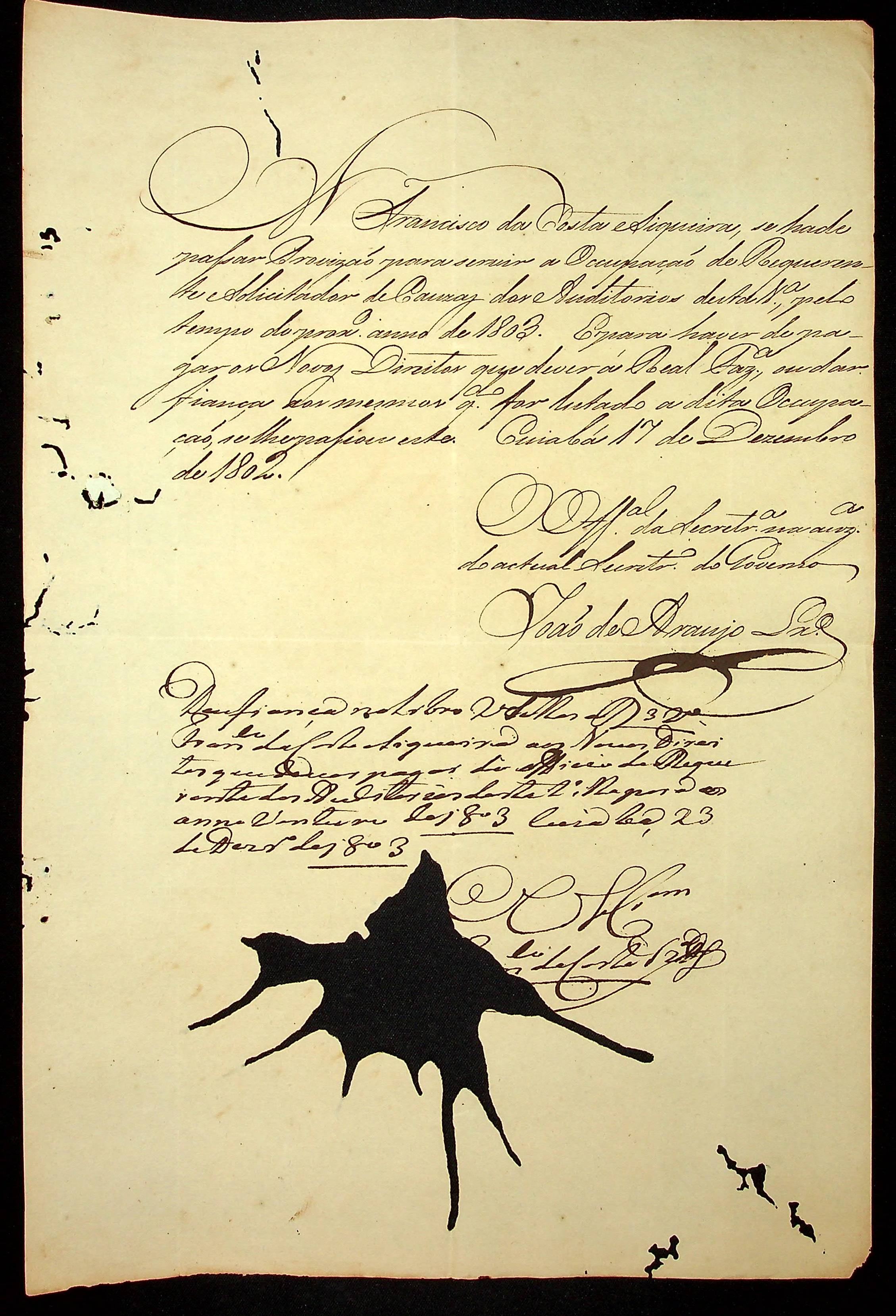 NOTIFICAÇÃO feita pelo oficial da Secretaria João de Araújo Lisboa á Francisco da Costa Siqueira para Pagamento de novos direitos e assim receber a provisão para servir o ofício de requerente solicitador de causas dos auditórios da Vila do Cuiabá.