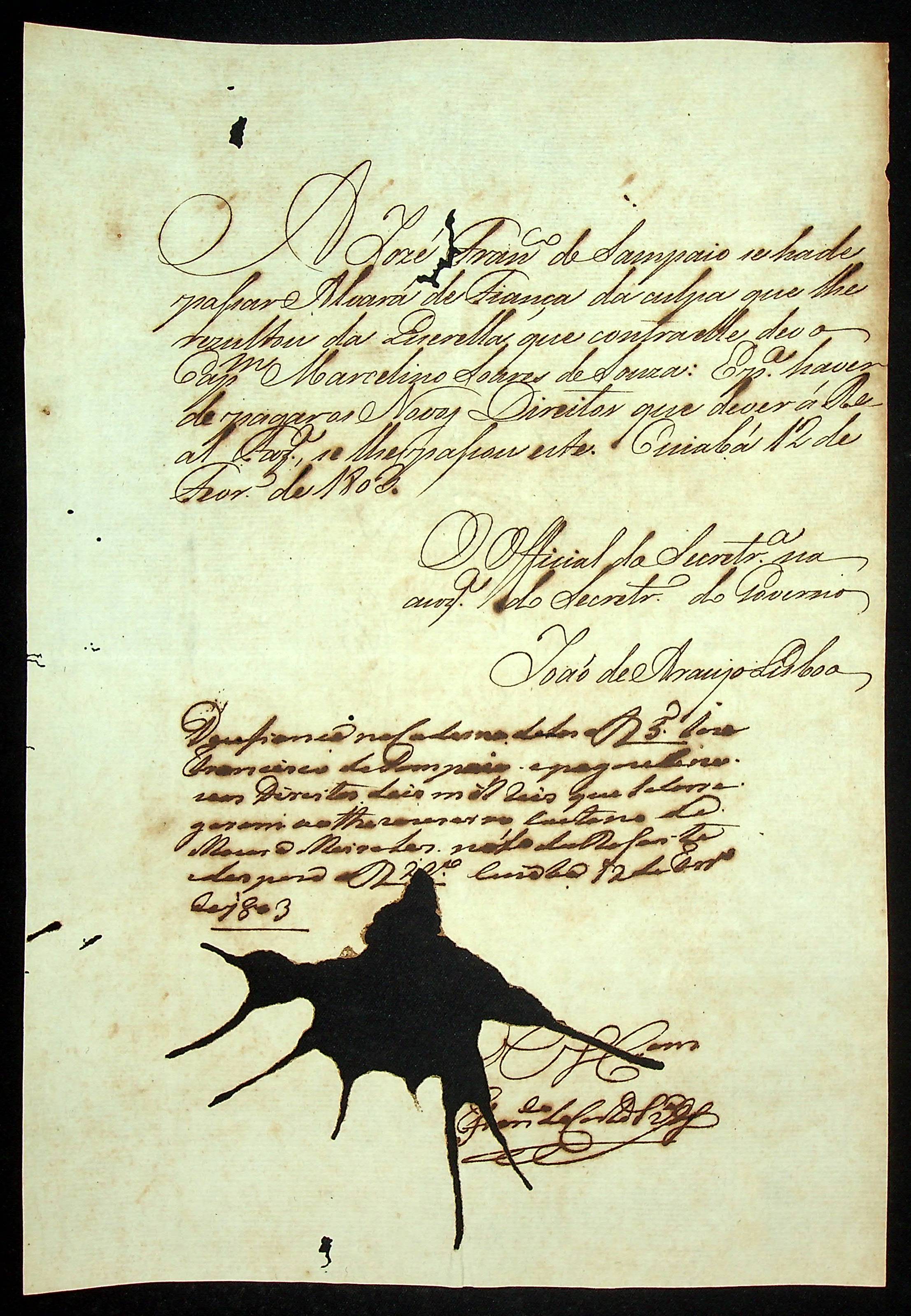 NOTIFICAÇÃO feita pelo [Secretário de Governo] João de Araújo Lisboa á José Francisco de Sampaio para o pagamento de novos direitos e assim passar alvará de Fiança da culpa que lhe resultou da Querela que contra ele deu o Capitão Marcelino Soares de Souza.
