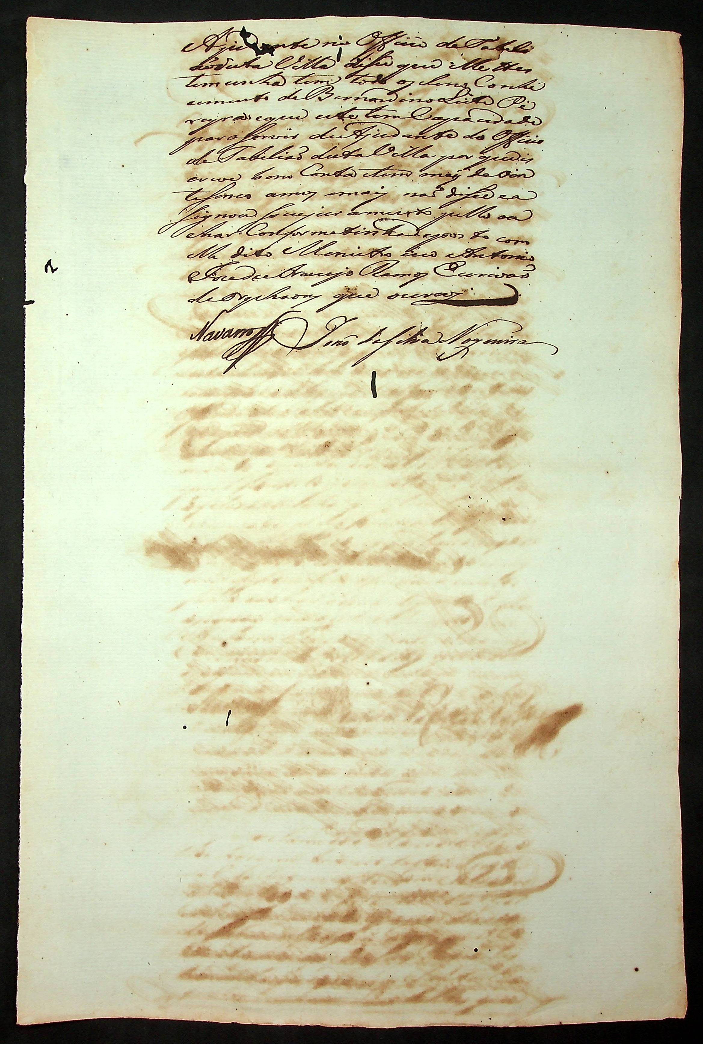 NOTIFICAÇÃO feita pelo Oficial Maior da Secretaria de Governo servido de Secretário João de Araújo Lisboa a Bernardino Leite Pereira para o pagamento de novos direitos pelo oficio de Escrevente do Tabelião Público e Judicial e Notas da Vila do Cuiabá.