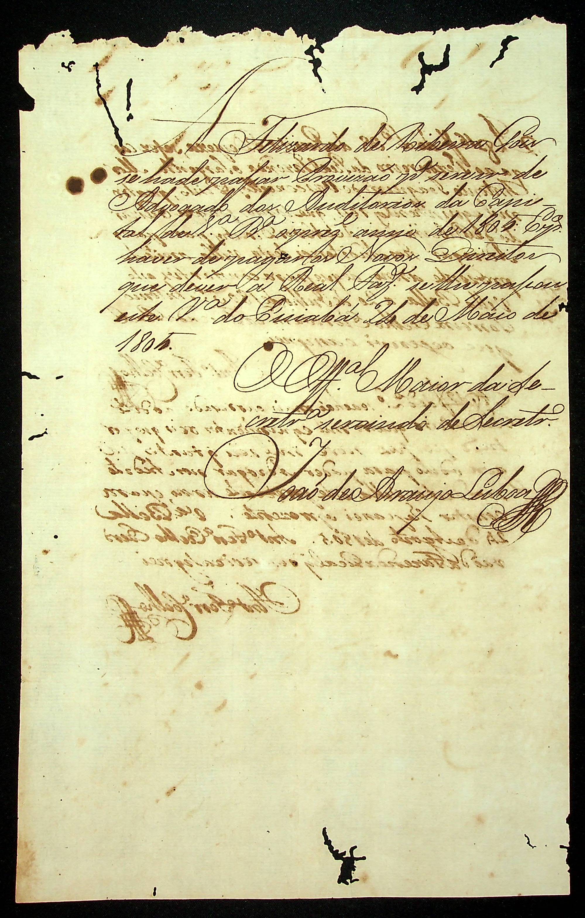 NOTIFICAÇÃO feita pelo Oficial Maior da Secretaria de Governo servindo de Secretário João de Araújo Lisboa á Felizardo de Ribeiro Góis para pagamento dos novos Direitos e assim receber provisão para servir de Advogado dos auditórios da Capital de Vila Bela.