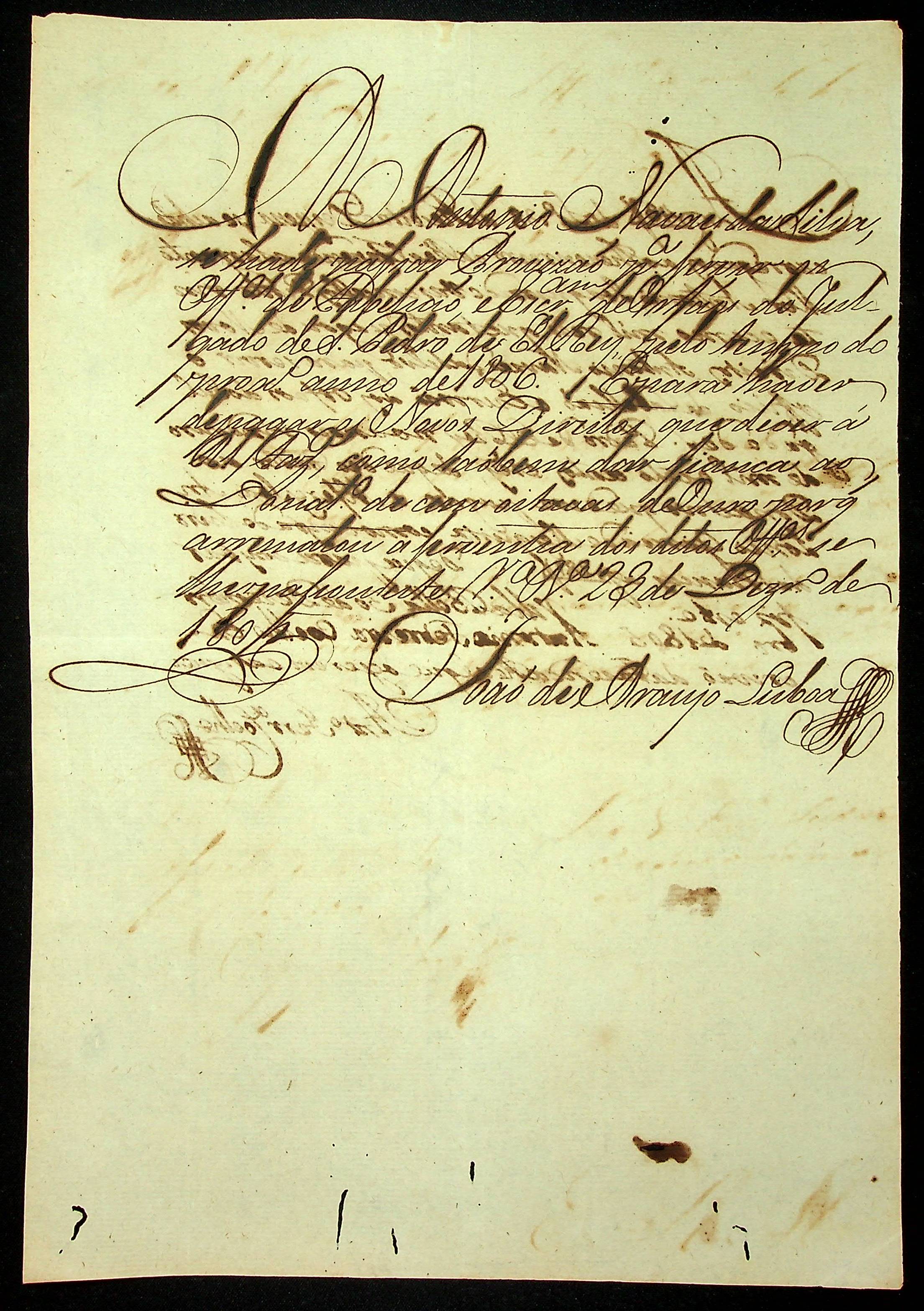 NOTIFICAÇÃO feita pelo [Secretário de Governo Interino] João de Araújo Lisboa a Antônio Novaes da Silva para pagamento de novos Direitos e assim receber Provisão para servir o Oficio de Tabelião e Escrivão de Órfãos do Julgado de São Pedro de El Rei.