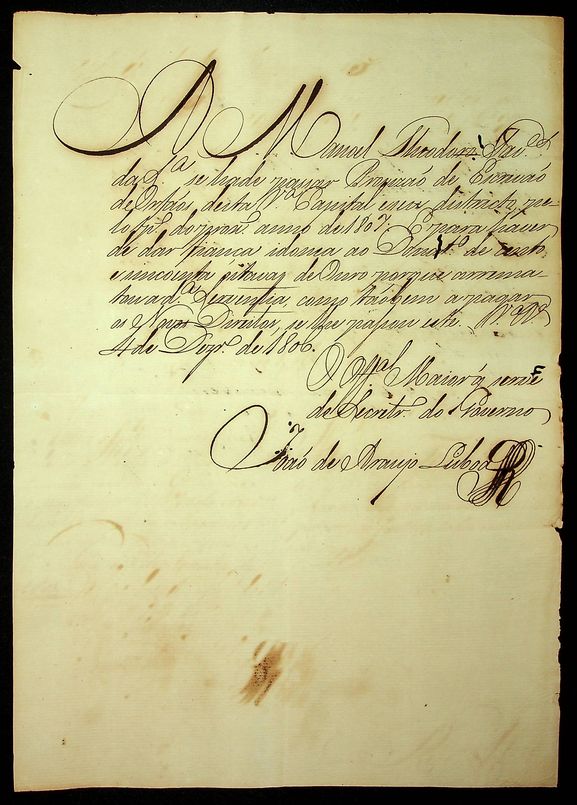 NOTIFICAÇÃO feita pelo [Secretário de Governo] João de Araújo Lisboa à Manuel Teodoro [...] da Silva para pagamento de novos direitos pelo ofício de Escrivão do Órfãos de Vila Bela.