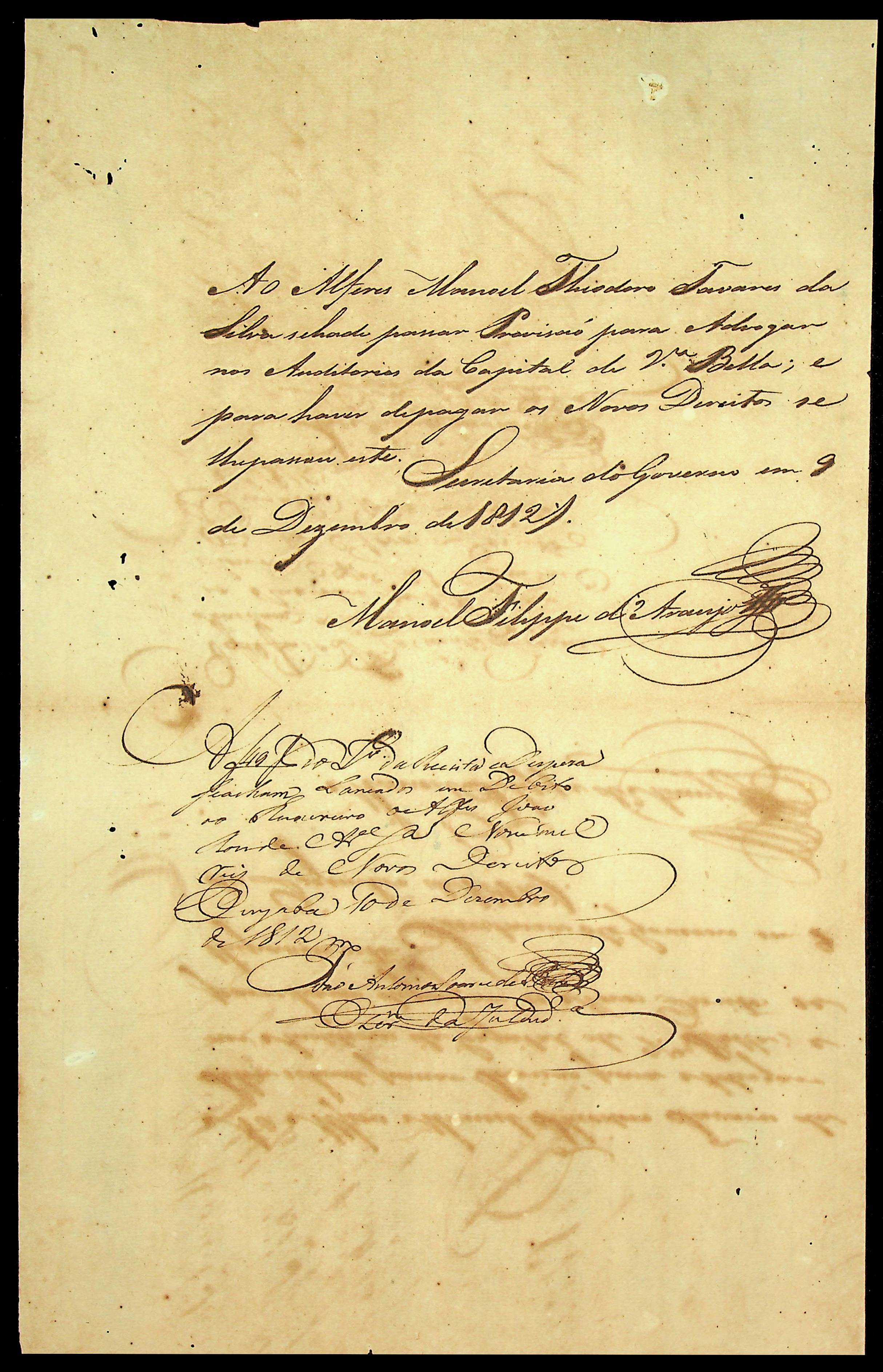NOTIFICAÇÃO feita pelo secretário de Governo Manoel Filipe d´Araújo ao Alferes Manoel Theodoro Tavares da Silva para o pagamento de novos direitos e assim passar provisão para advogar nos auditórios da Capital de Vila Bela.