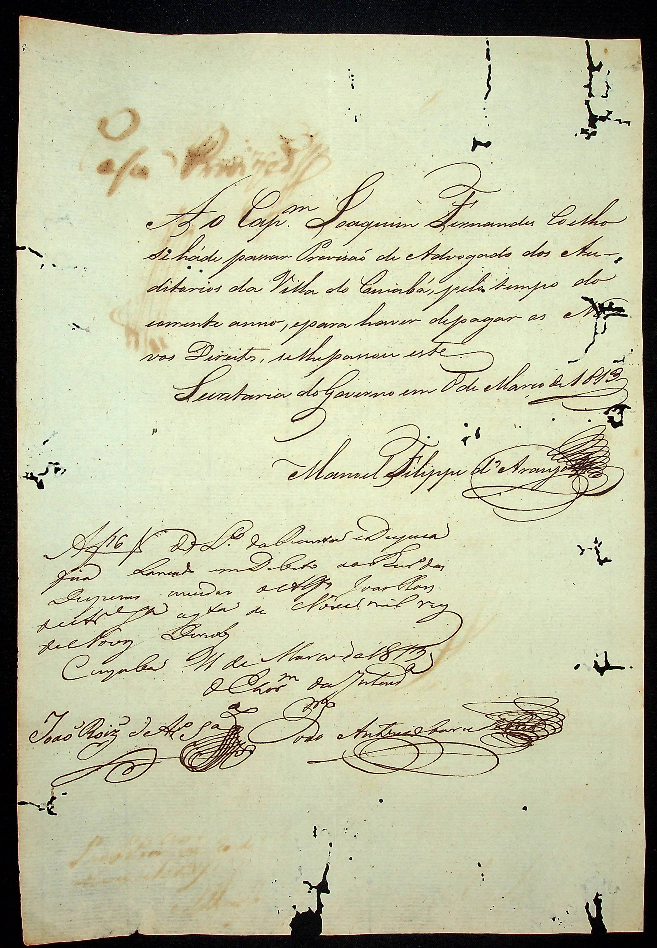 NOTIFICAÇÃO feita pelo Secretário de Governo Manoel Filipe de Araújo ao Capitão Joaquim Fernandes Coelho.