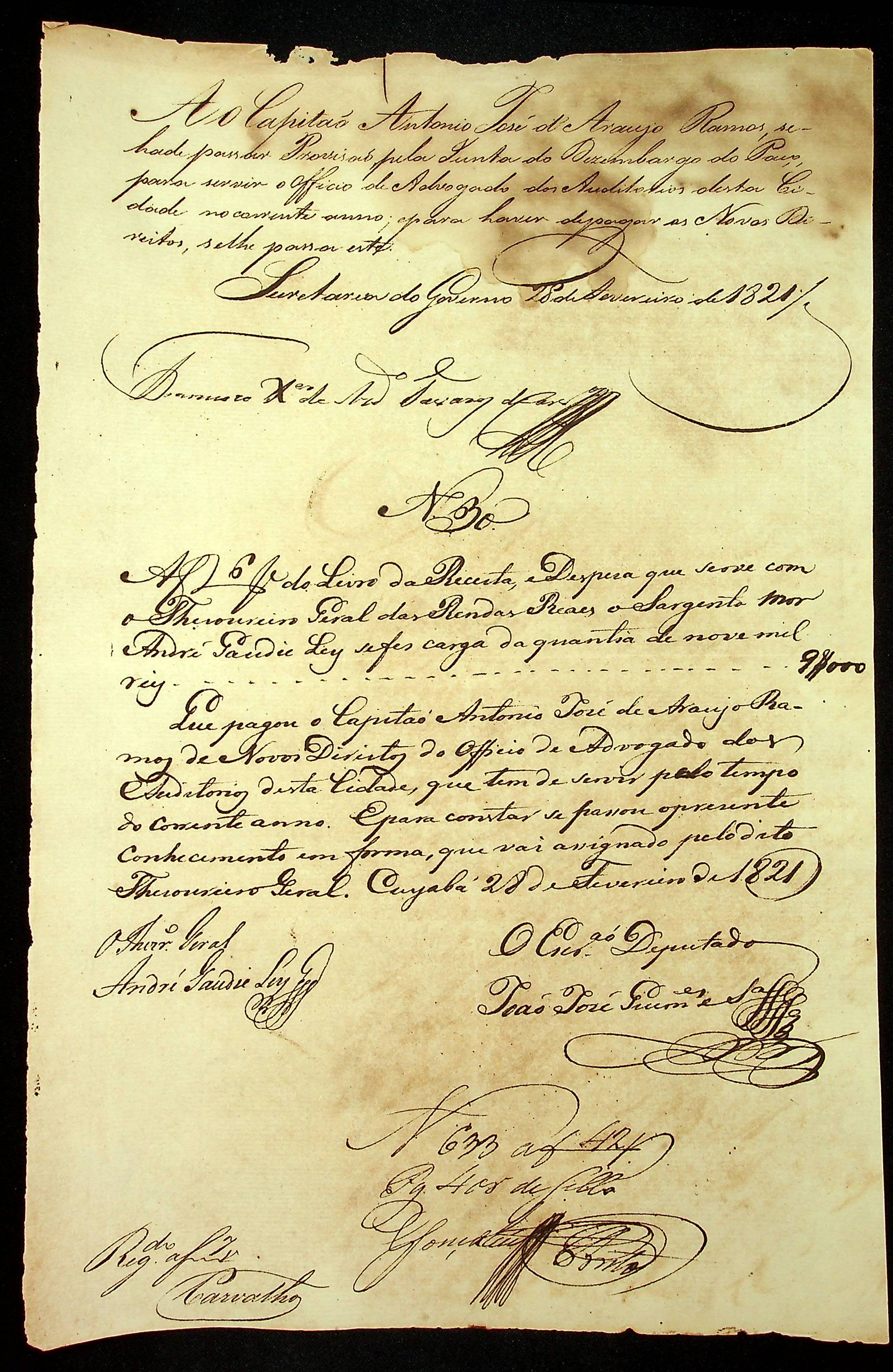 NOTIFICAÇÃO feita pelo [Secretário de Governo] Francisco Xavier de Azevedo Tavares ao Capitão Antônio José de Araújo Ramos para pagamento dos novos direitos.