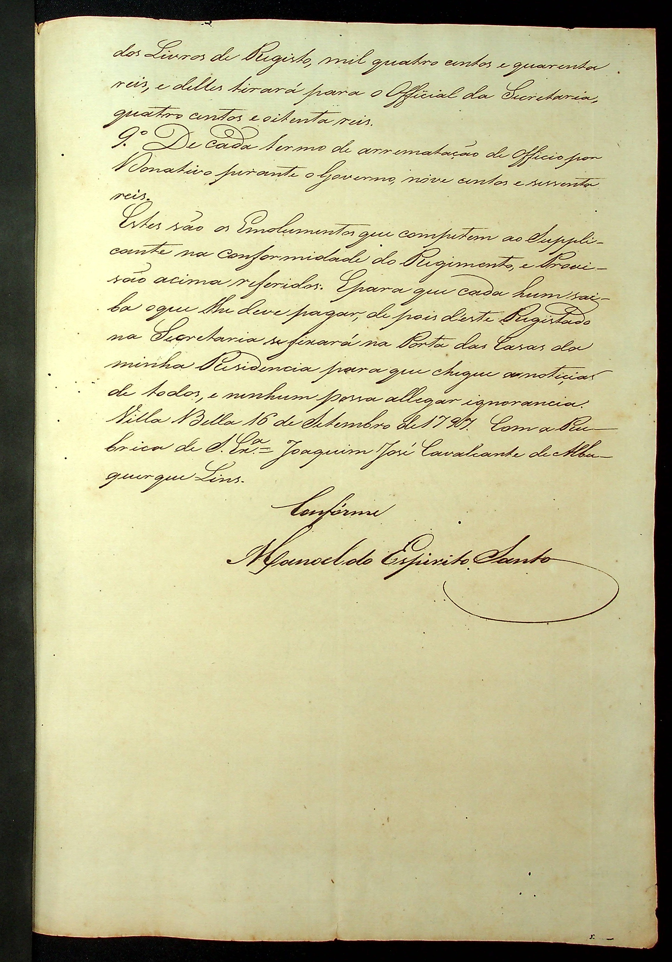 ORDEM (traslado) do [Governador e Capitão-General da Capitania de Mato Grosso Caetano Pinto de Miranda e Montenegro], regulamenta o paramento de emolumentos.