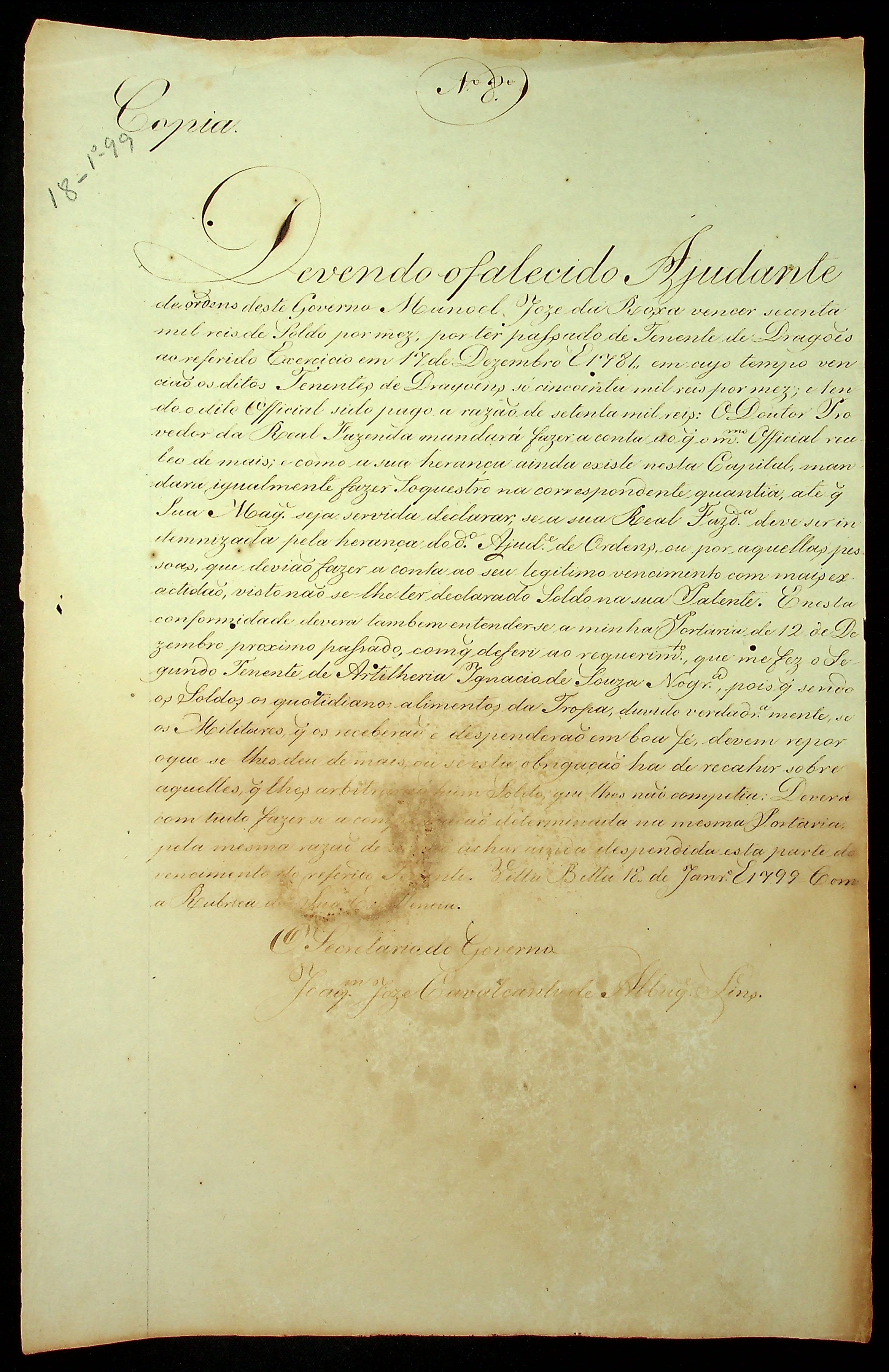 ORDEM (cópia) do [Governador e Capitão-General da Capitania de Mato Grosso Caetano Pinto de Miranda e Montenegro] ao Provedor da Real Fazenda e Intendência do Ouro da Capitania de Mato Grosso José Félix de Araújo.