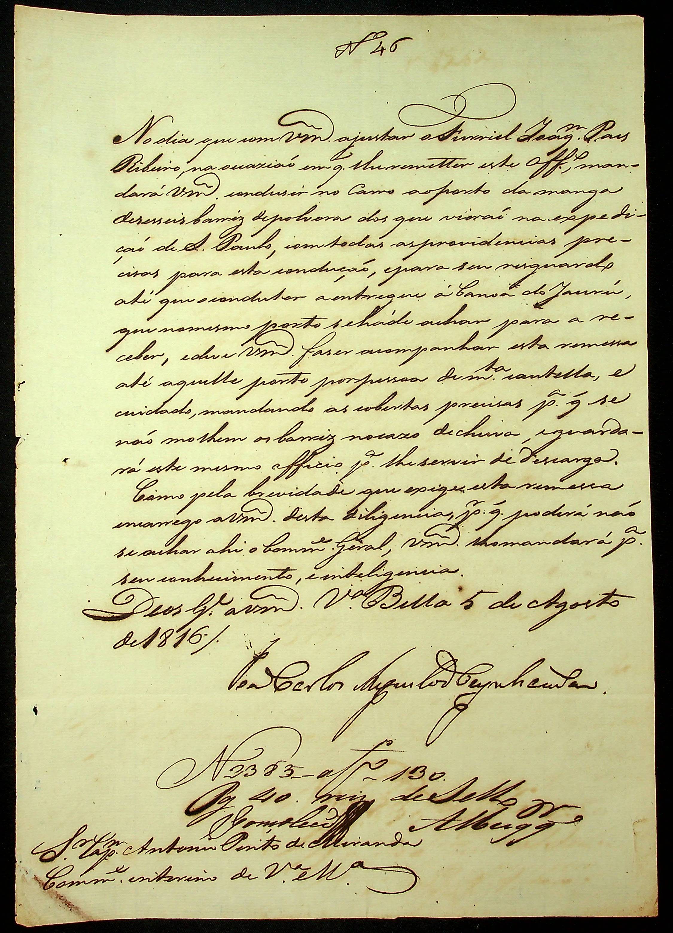 ORDEM do [Governador e Capitão General da Capitania de Mato Grosso] João Carlos Augusto de Oeynhausen e Gravemberg ao Capitão Comandante interino de Vila Maria Antônio Pinto de Miranda.