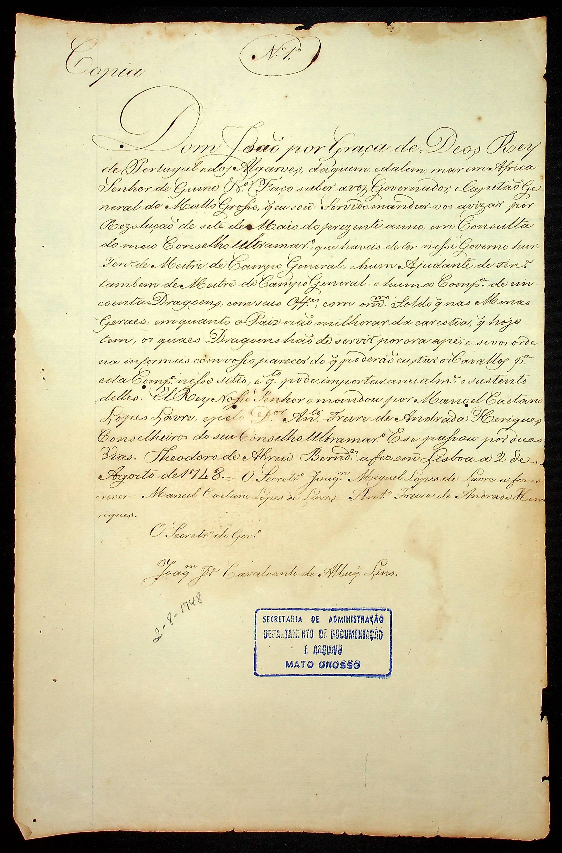 ORDEM RÉGIA (cópia) do Rei de Portugual Dom João ao Governador e Capitão General da Capitania de Mato Grosso.