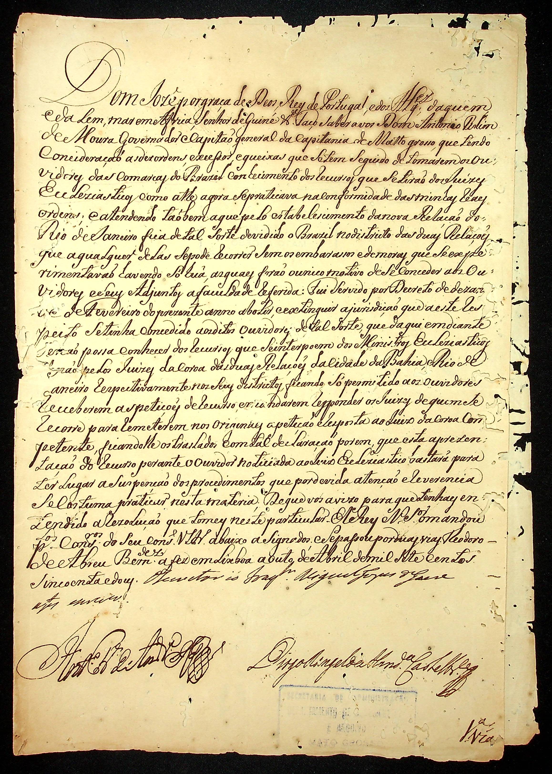 ORDEM RÉGIA do Rei D. José para o Governador e Capitão General da Capitania de Mato Grosso Antônio Rolim de Moura.