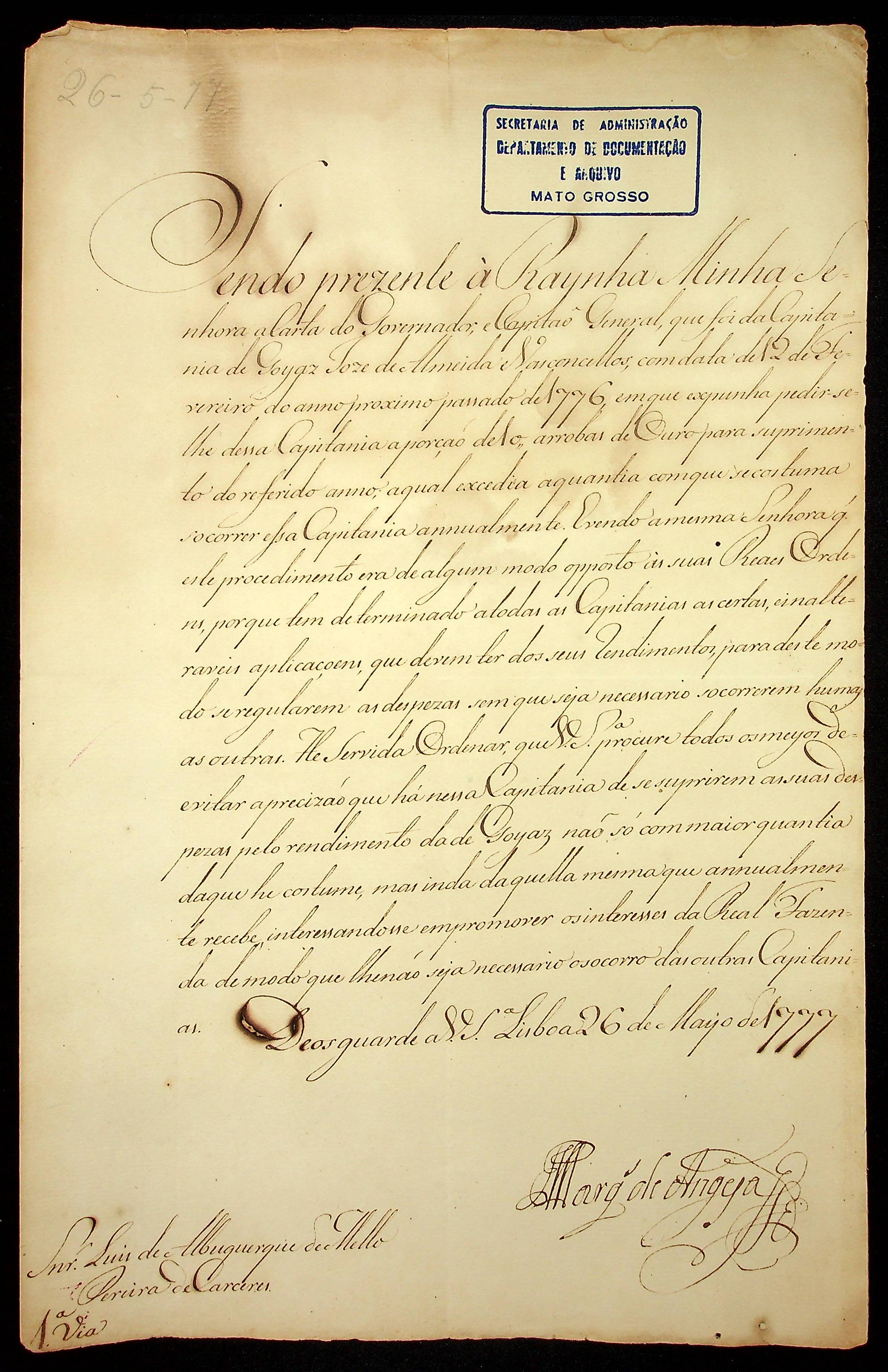 ORDEM RÉGIA da Rainha [Maria] para o [Governador e Capitão General da Capitania de Mato Grosso] Luís de Albuquerque de Melo Pereira e Cáceres.
