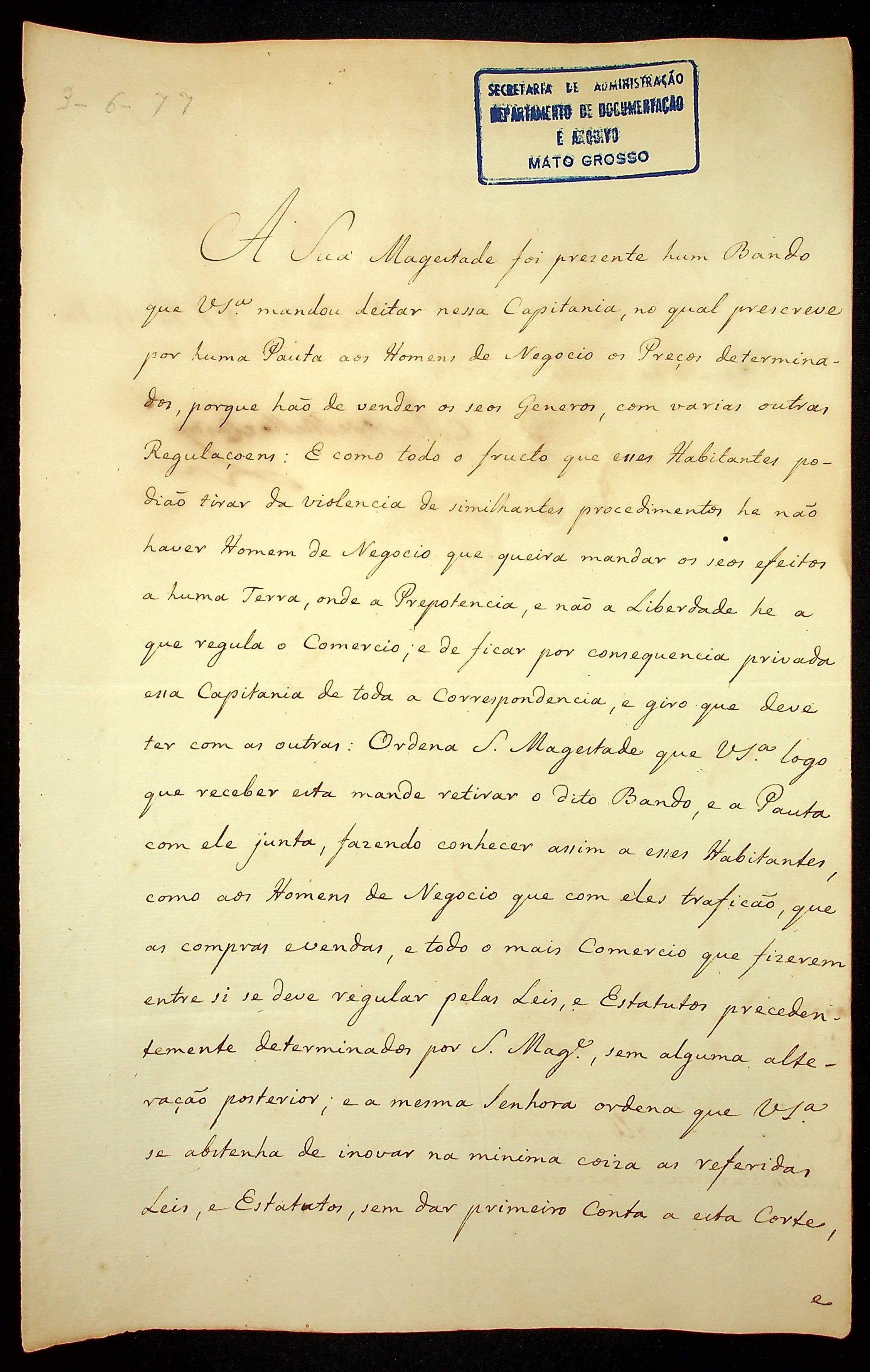 ORDEM RÉGIA da Rainha ao Governador e Capitão General da Capitania de Mato Grosso Luís de Albuquerque de Melo Pereira e Cáceres.