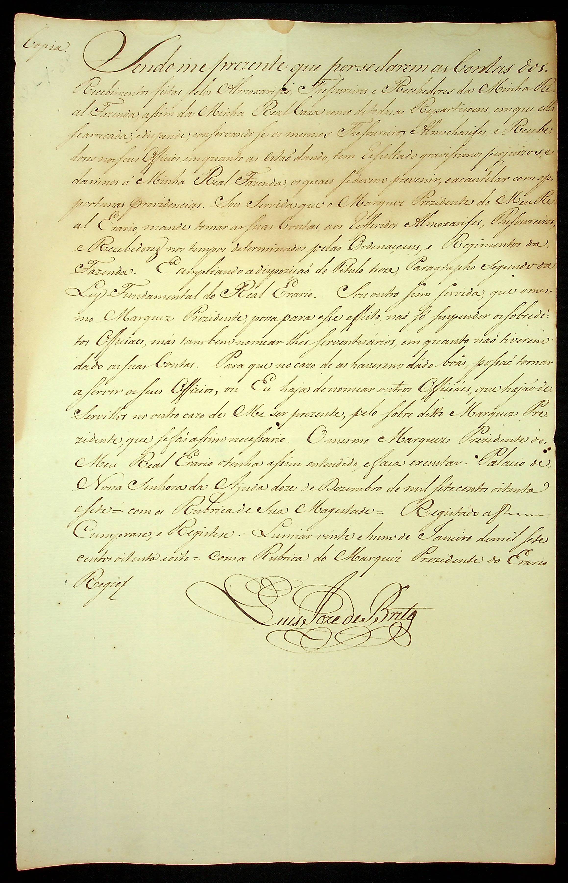 ORDEM RÉGIA (cópia) da Rainha [d. Maria] ao Marques Presidente do Real Erário.