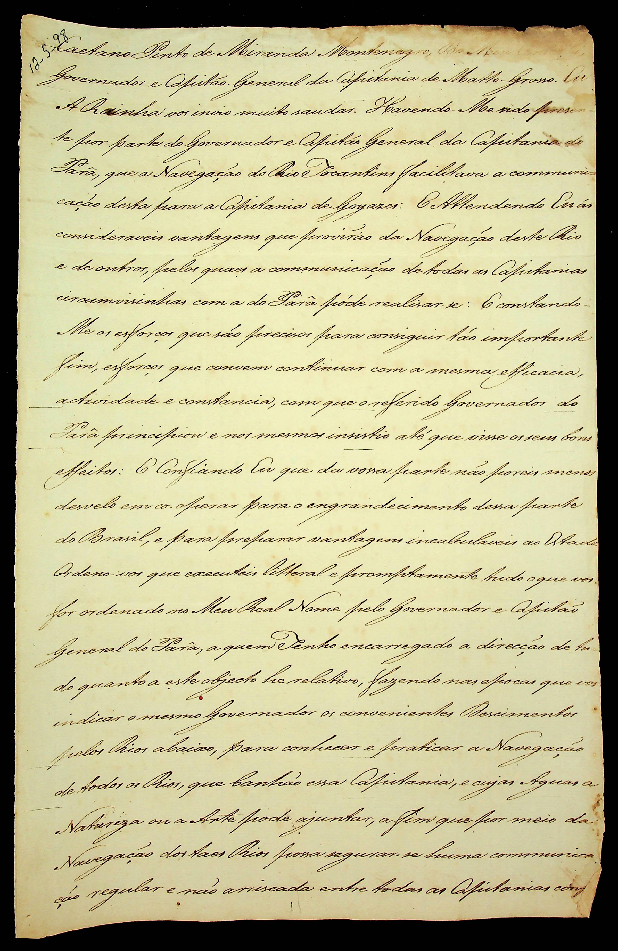 ORDEM RÉGIA da Rainha [D. Maria] ao Governador e Capitão General da Capitania de Mato Grosso Caetano Pinto de Miranda e Montenegro.