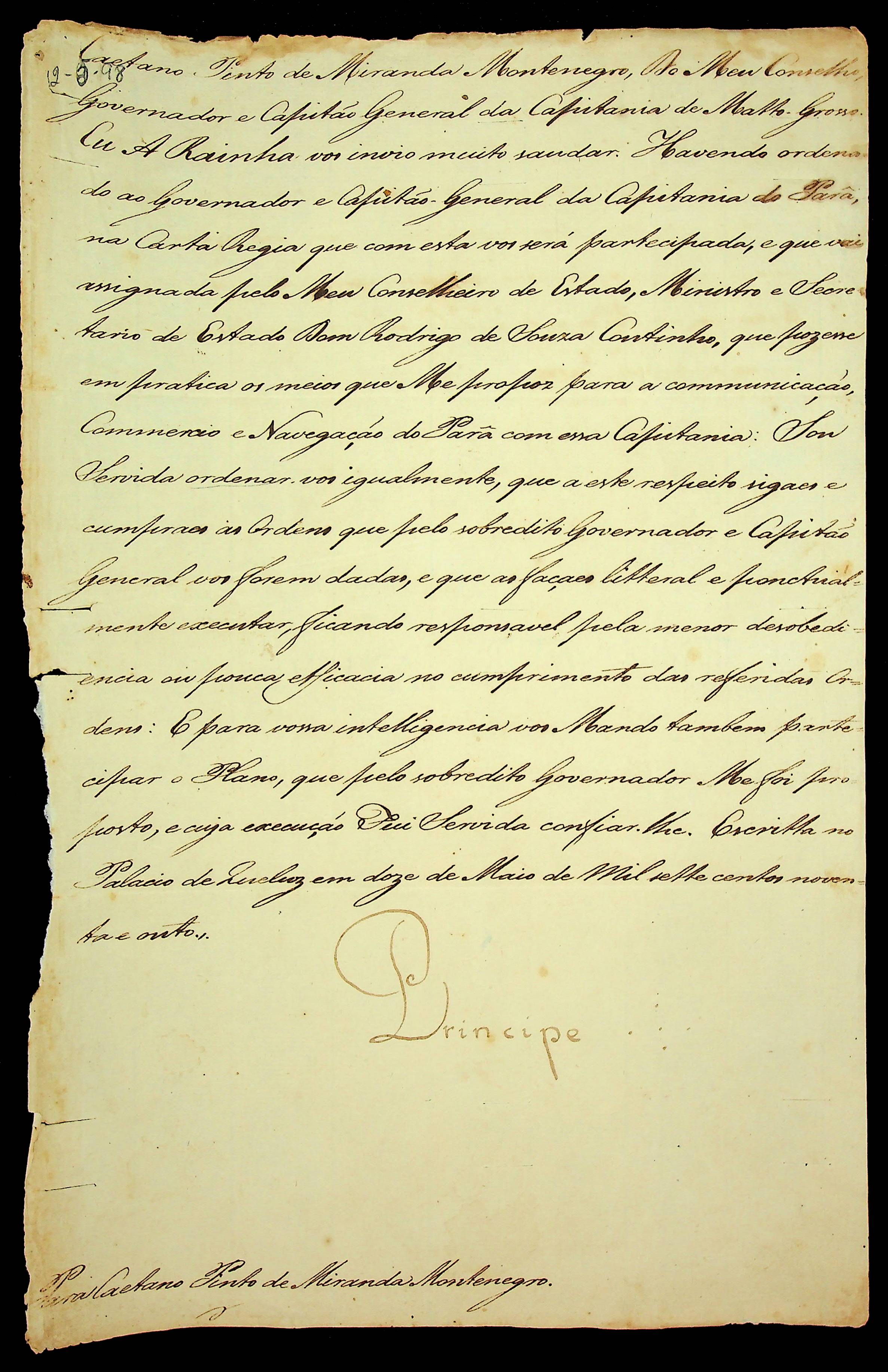 ORDEM RÉGIA da Rainha [D. Maria] ao Governador e Capitão General da Capitania de Mato Grosso Caetano Pinto de Miranda e Montenegro.