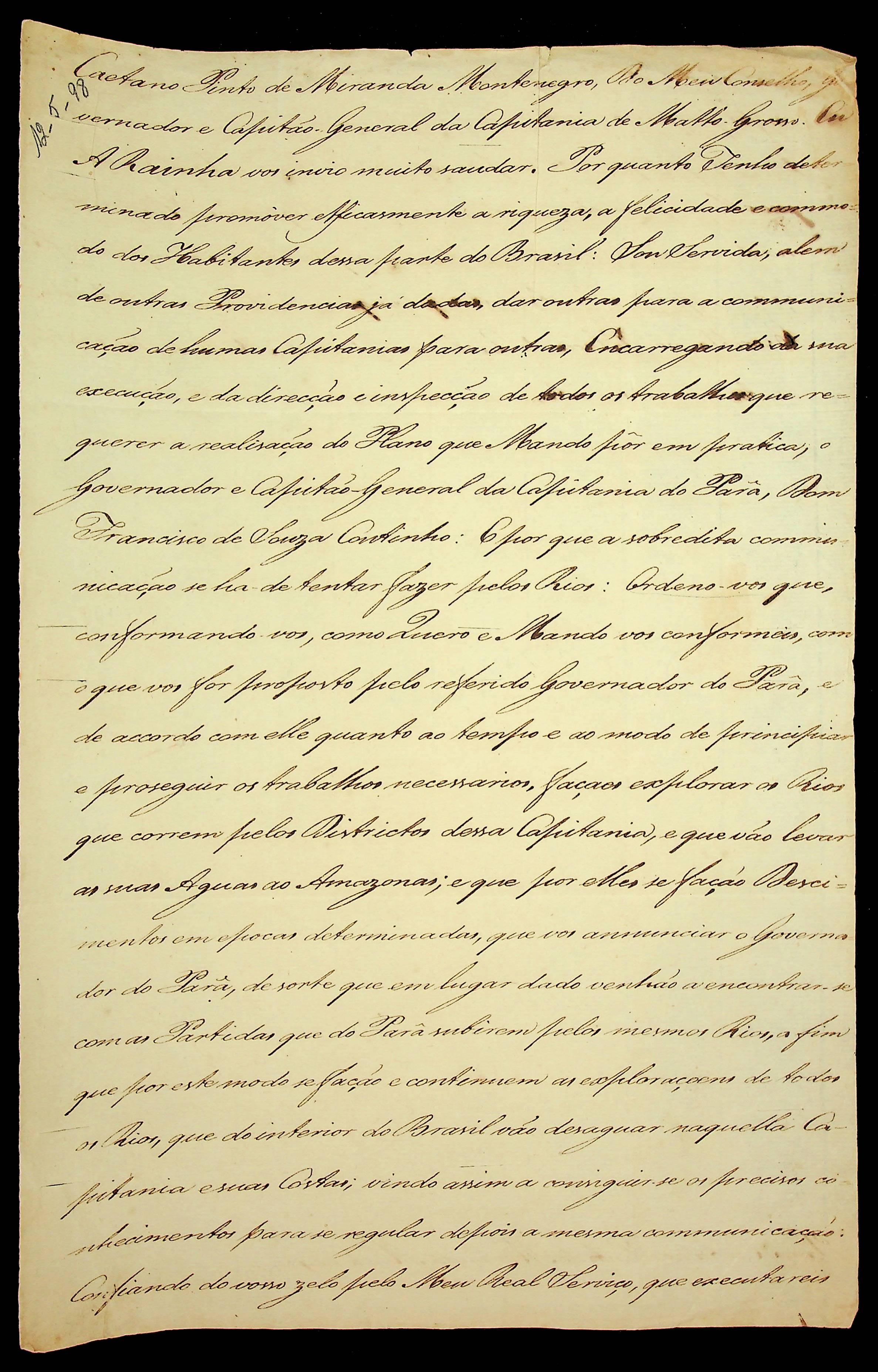 ORDEM RÉGIA da Rainha [D. Maria] ao Governador e Capitão General da Capitania de Mato Grosso Caetano Pinto de Miranda e Montenegro.