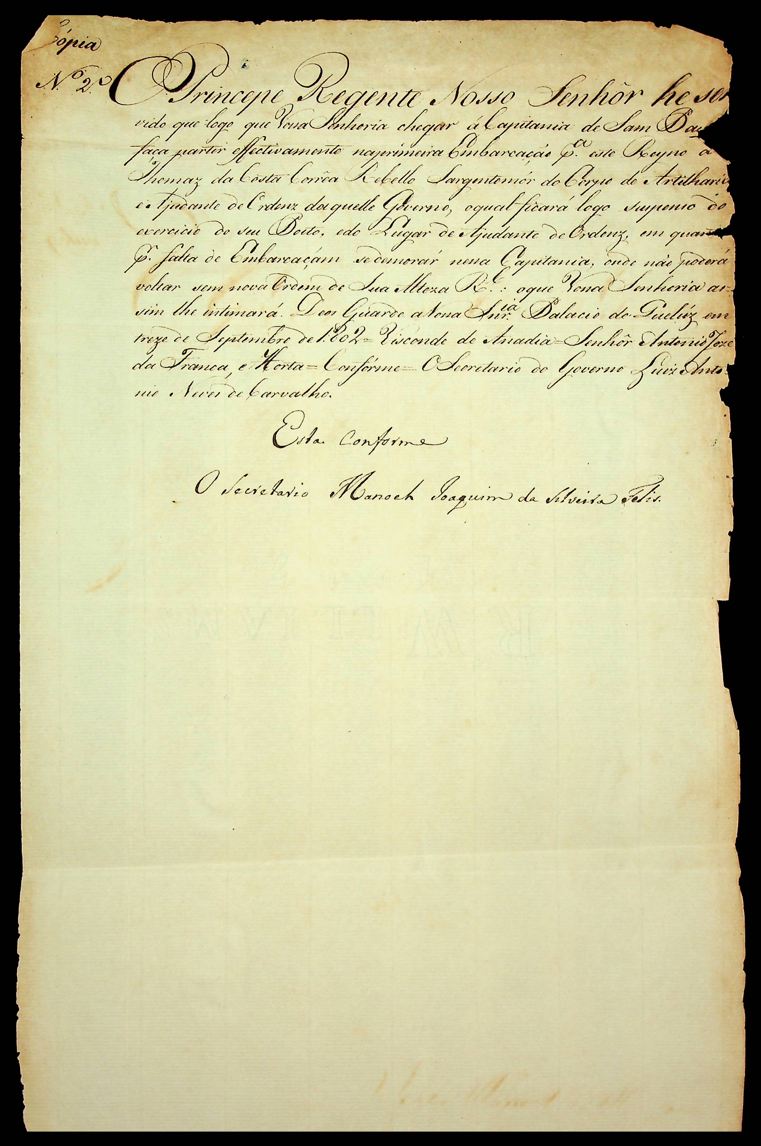 ORDEM RÉGIA (cópia) do Príncipe Regente D. João ao [Governador e Capitão General da Capitania de São Paulo] Antônio José Franca Horta.