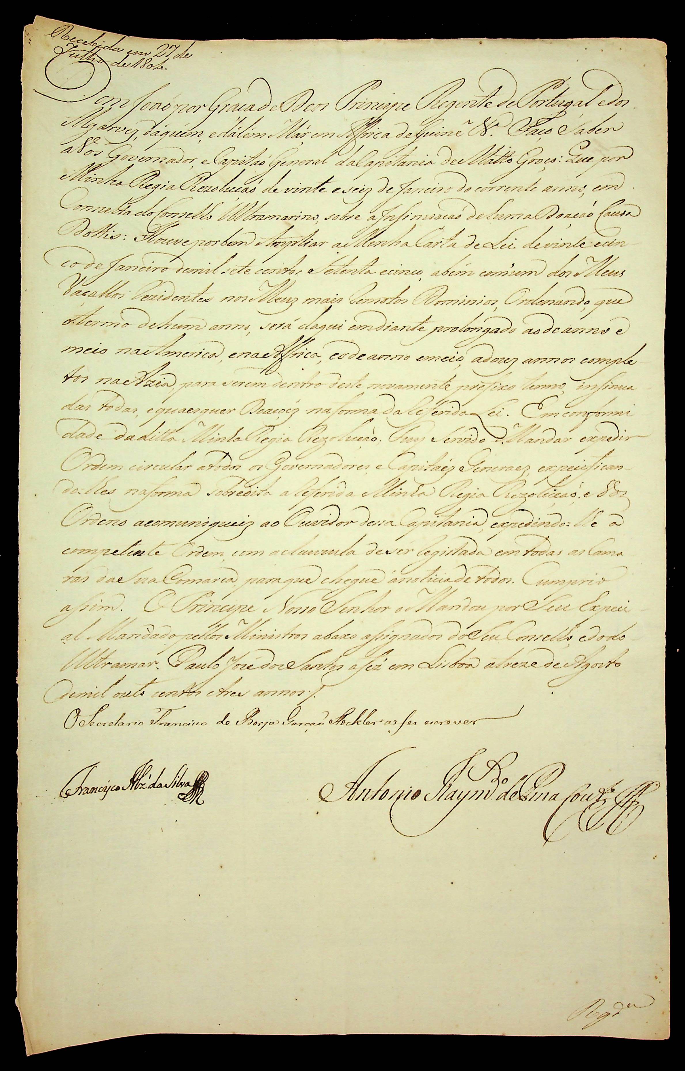 ORDEM RÉGIA do Príncipe Regente D. João ao Governador e Capitão General da Capitania de Mato Grosso [Caetano Pinto de Miranda e Montenegro].