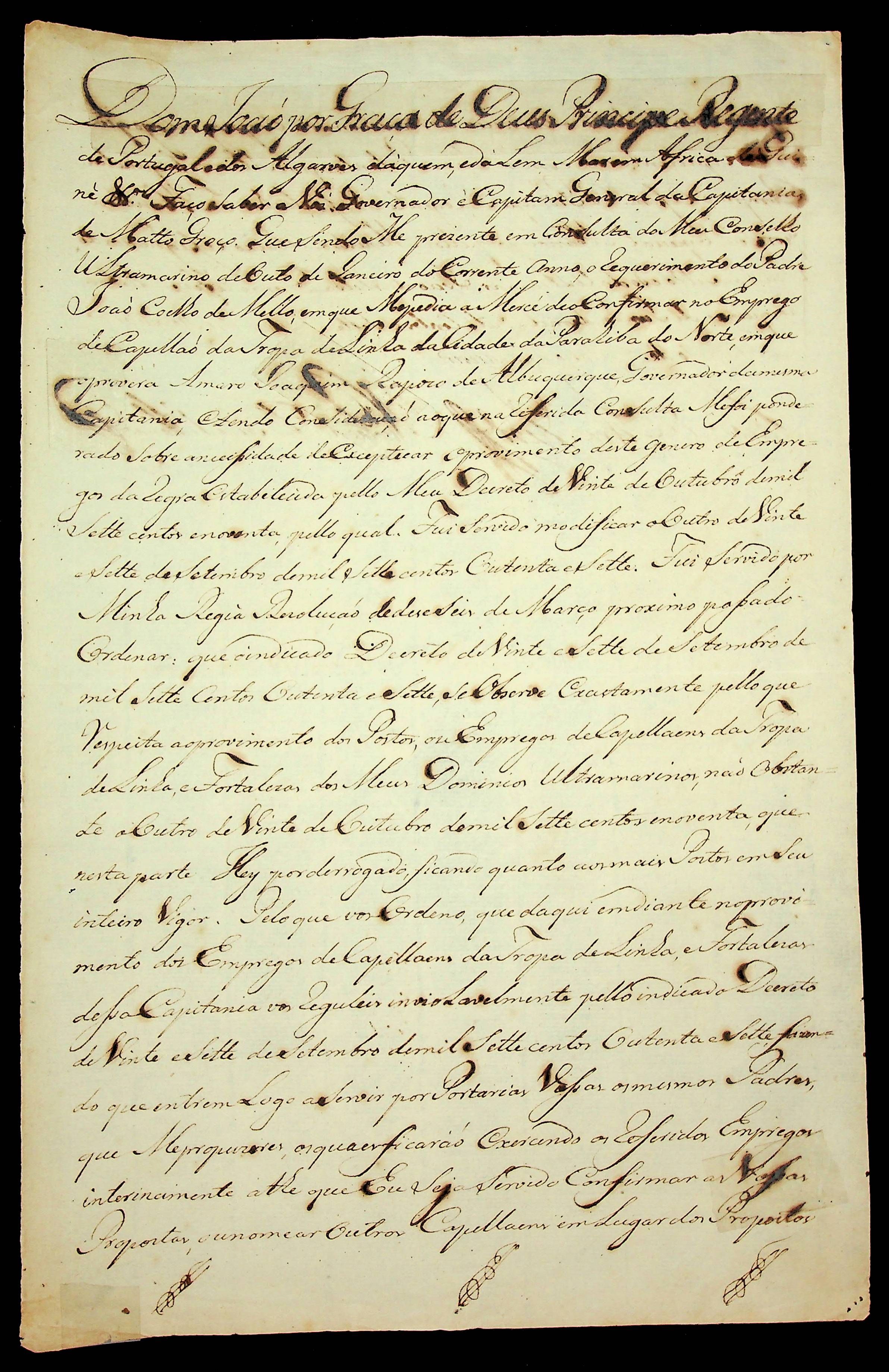 ORDEM RÉGIA do Príncipe Regente D. João ao Governador e Capitão General da Capitania de Mato Grosso.