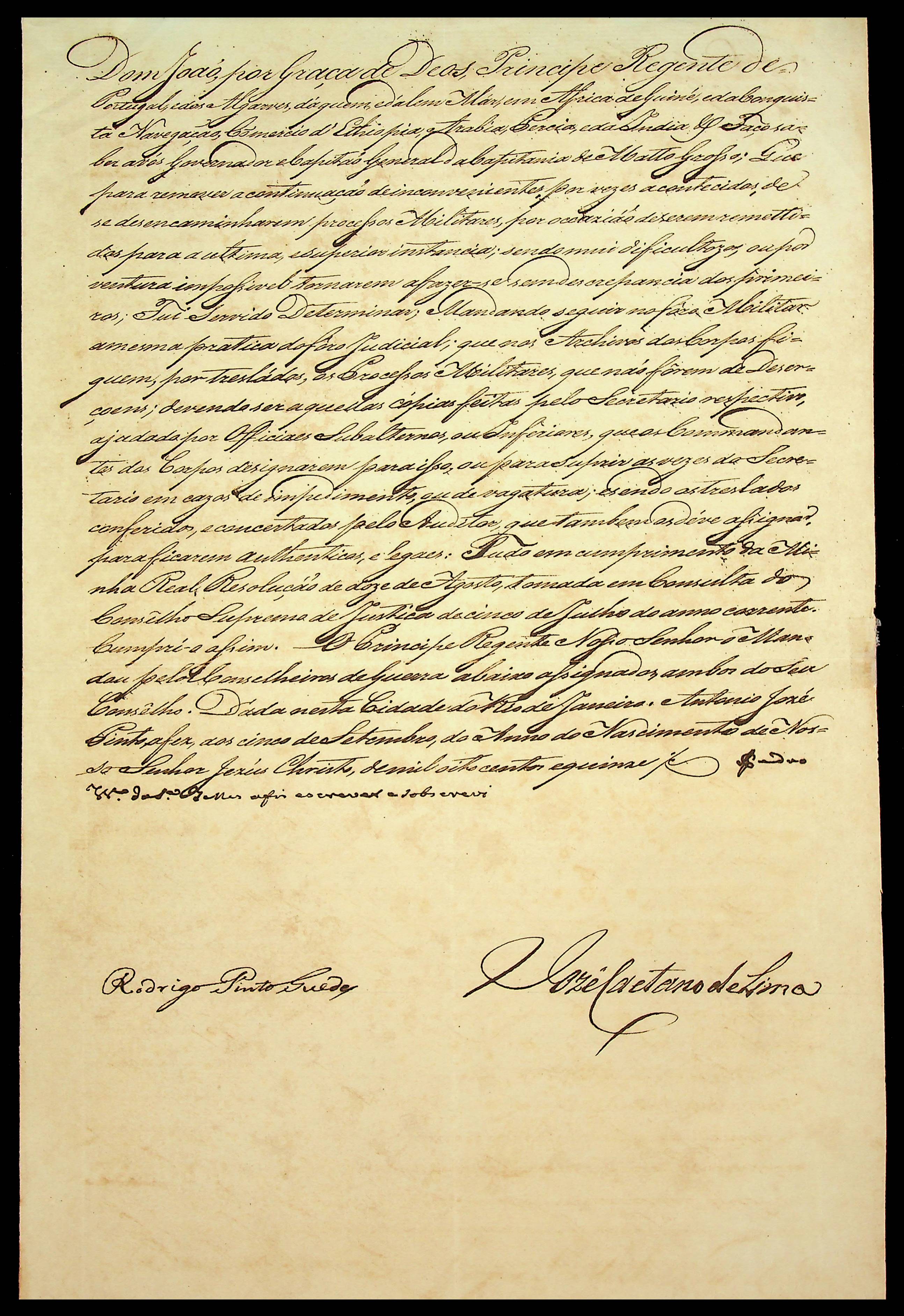 ORDEM RÉGIA do Príncipe Regente D. João ao Governador e Capitão General da Capitania de Mato Grosso [João Carlos Augusto de Oeynhausen Gravemberg].
