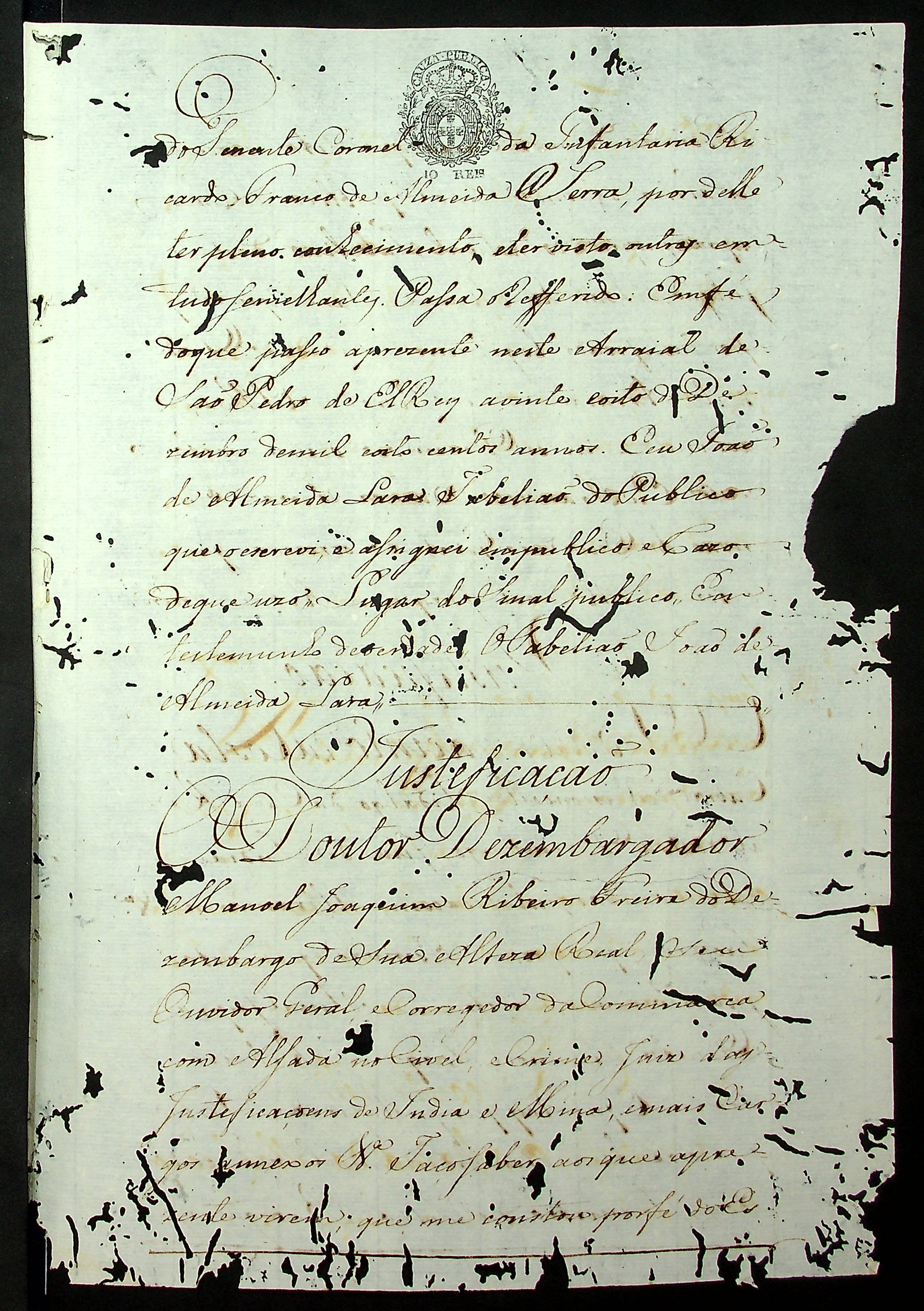 PROCESSO de Justificação (incompleto) em que Manoel José Araújo requer junto ao [Príncipe Regente D.João VI] que lhe passe a patente de Ajudante o Alferes do Regimento de Milícia da Capitania de Mato Grosso.