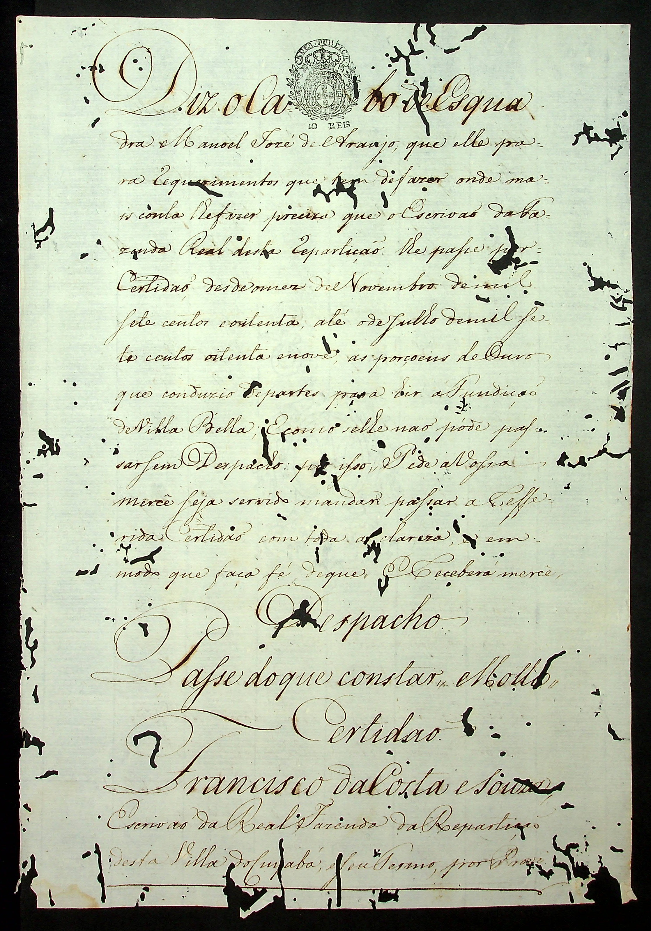 PROCESSO de Justificação (incompleto) em que Manoel José Araújo requer junto ao [Príncipe Regente D.João VI] que lhe passe a patente de Ajudante o Alferes do Regimento de Milícia da Capitania de Mato Grosso.