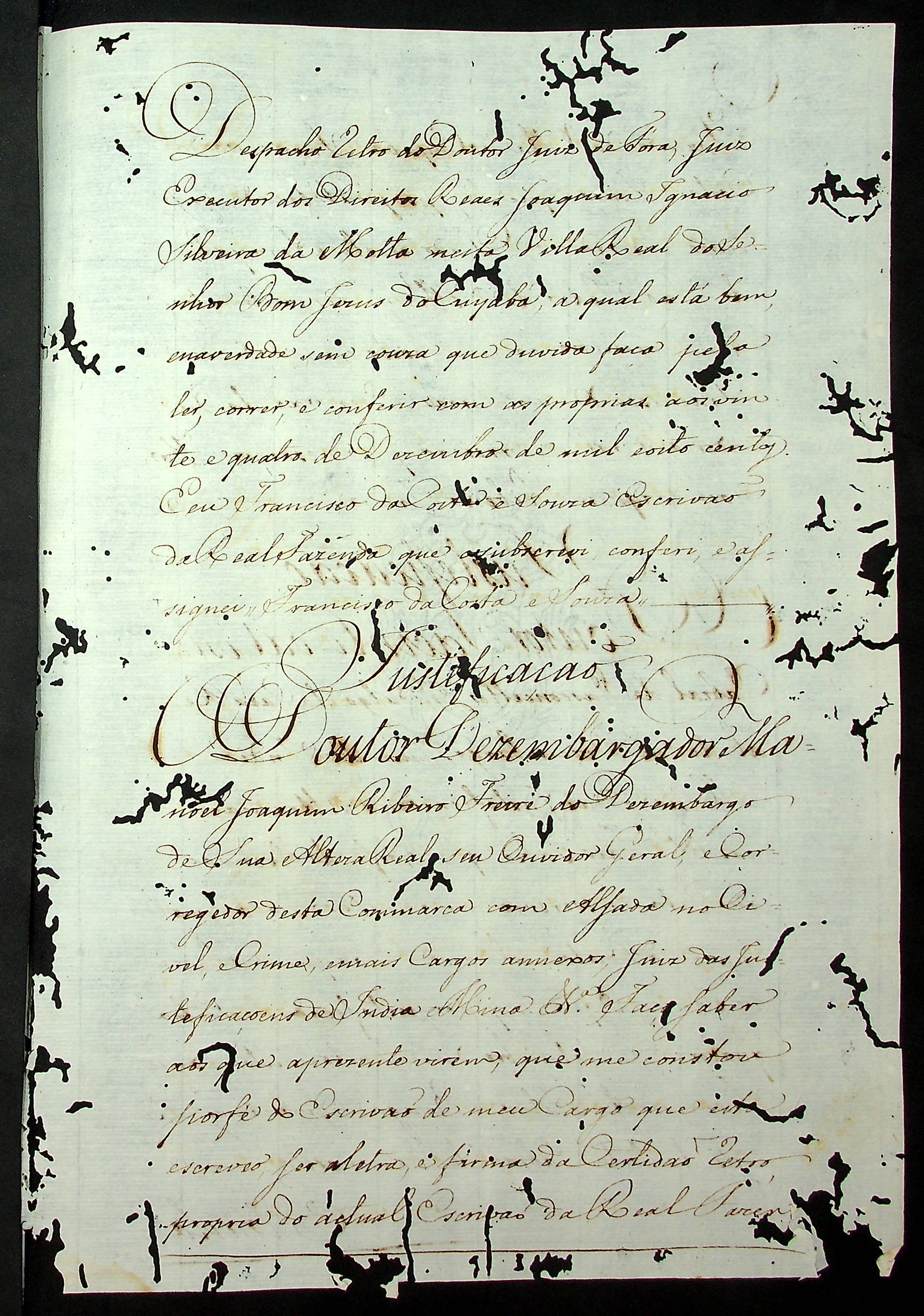 PROCESSO de Justificação (incompleto) em que Manoel José Araújo requer junto ao [Príncipe Regente D.João VI] que lhe passe a patente de Ajudante o Alferes do Regimento de Milícia da Capitania de Mato Grosso.