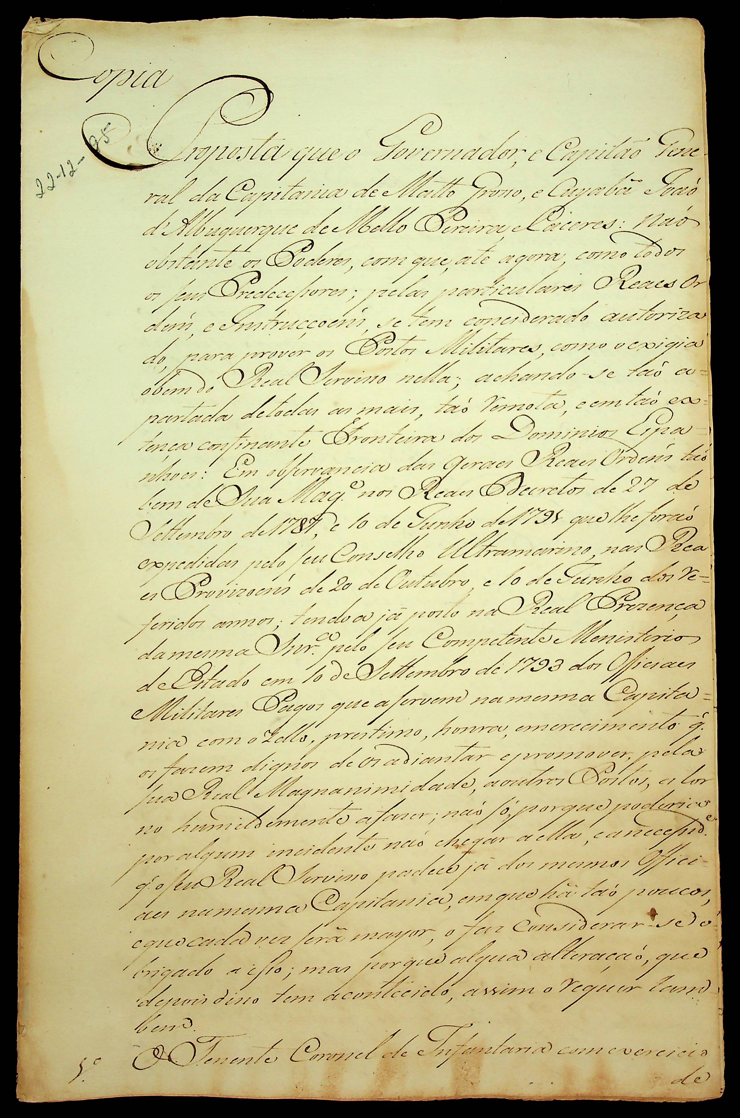 PARECER do Governador e Capitão-General da Capitania de Mato Grosso João de Albuquerque de Melo Pereira e Cáceres para a [Rainha].