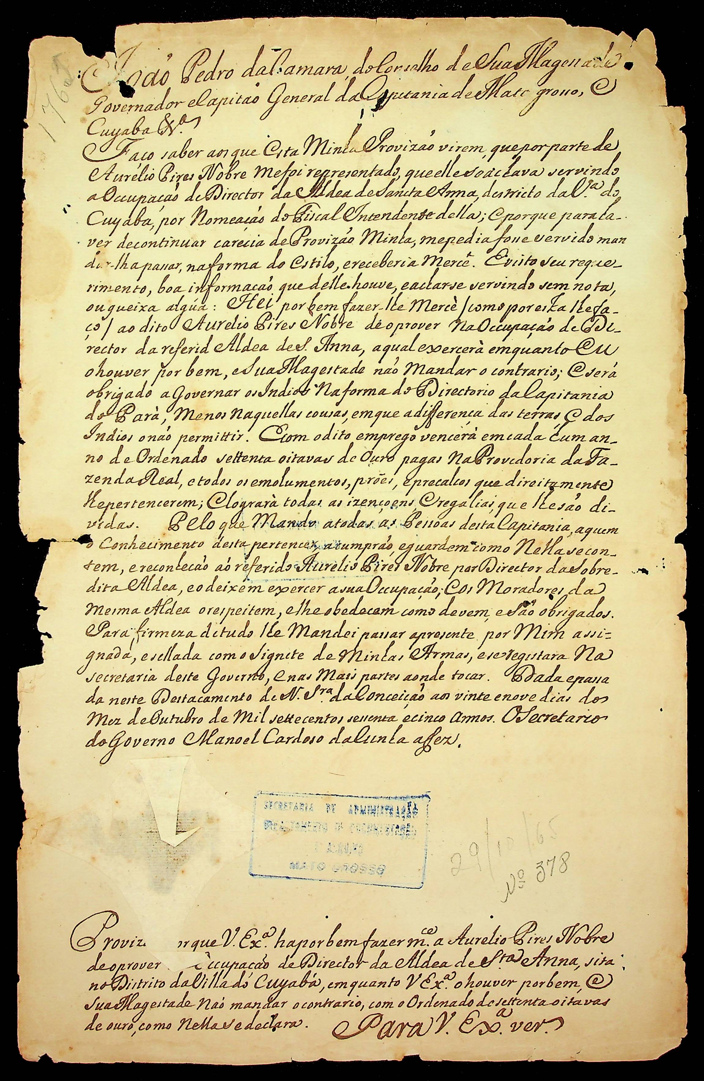 PROVISÃO expedida pelo Governador e Capitão-General da Capitania de Mato Grosso João Pedro da Câmara a Aurélio Pires Nobres para continuar exercendo a ocupação de diretor da Aldeia de Santa Ana, distrito da Vila do Cuiabá.