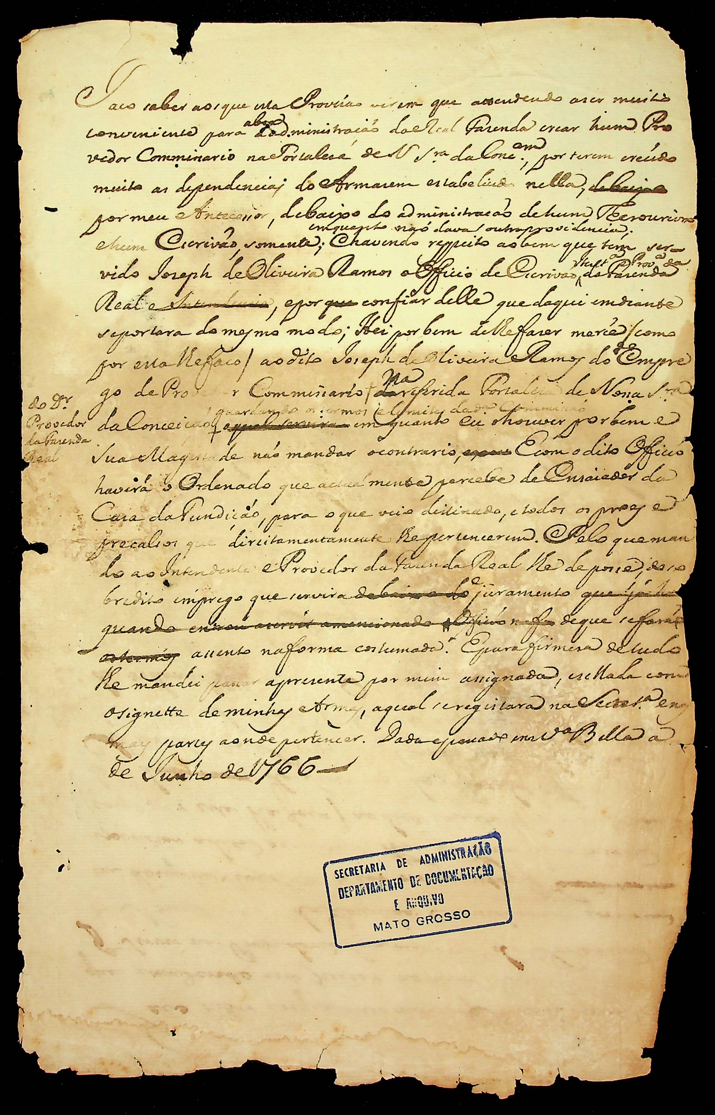 PROVISÃO expedida pelo [Governador e Capitão-General da Capitania de Mato Grosso Luís Pinto de Souza Coutinho] para o cargo de Intendente Comissário José de Oliveira Ramos.
