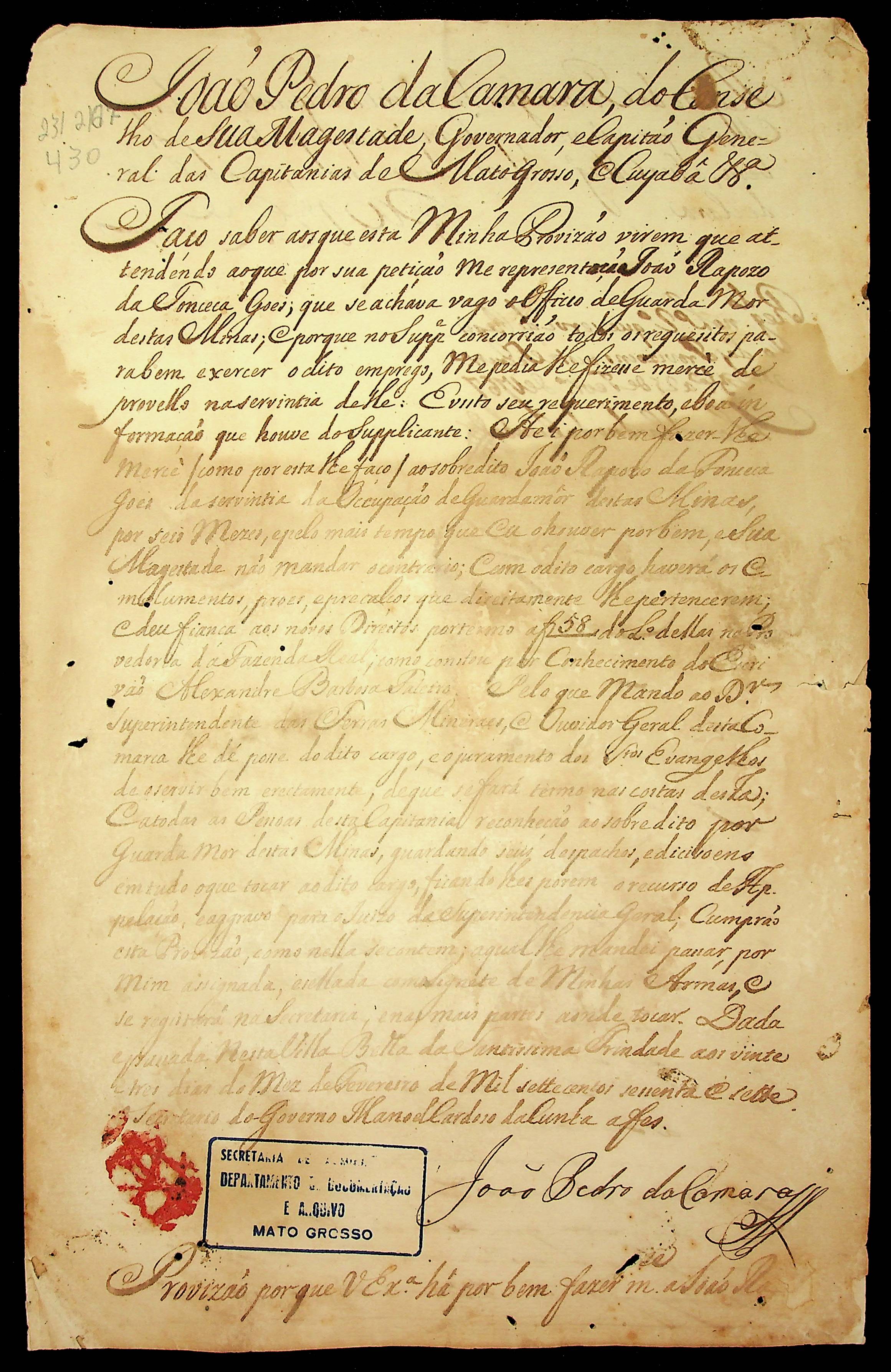 PROVISÃO do Governador e Capitão-General da Capitania de Mato Grosso João Pedro da Câmara, nomeando João Raposo da Fonseca Góes ao ofício de Guarda Mor das Minas.