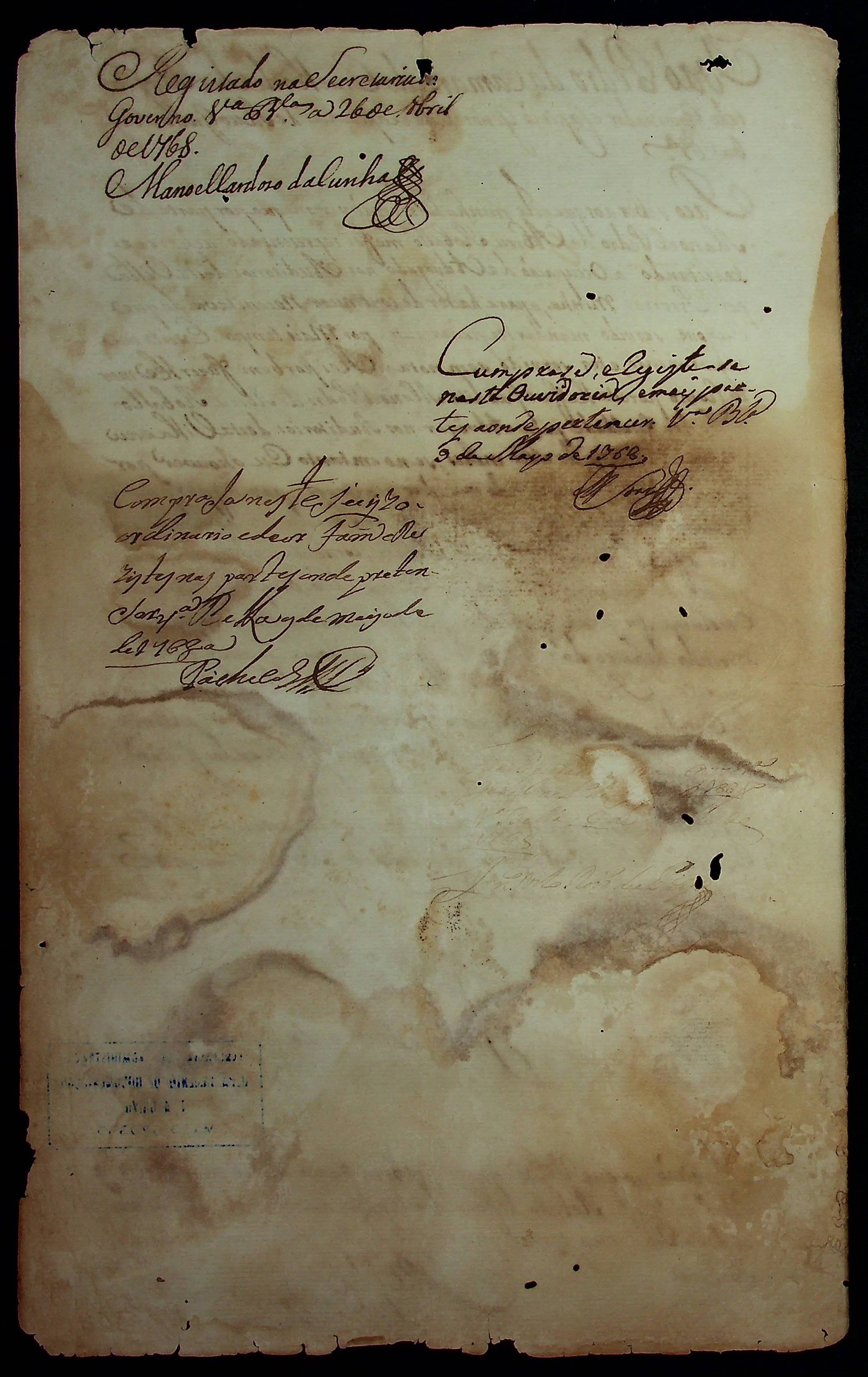 PROVISÃO do Governador e Capitão-General da Capitania de Mato Grosso João Pedro da Câmara a Manoel Pedro de Abreu Roballo de faculdade para advogar nos auditórios de Vila Bela.