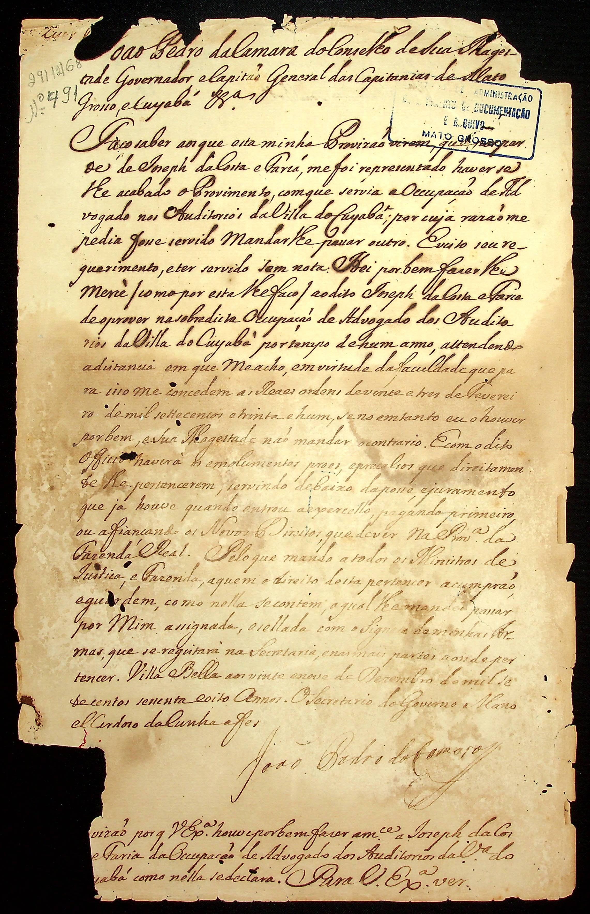 PROVISÃO do Governador e Capitão-General da Capitania de Mato Grosso João Pedro da Câmara, a José da Costa e Faria para ocupação de advogado nos auditórios da Vila do Cuiabá.