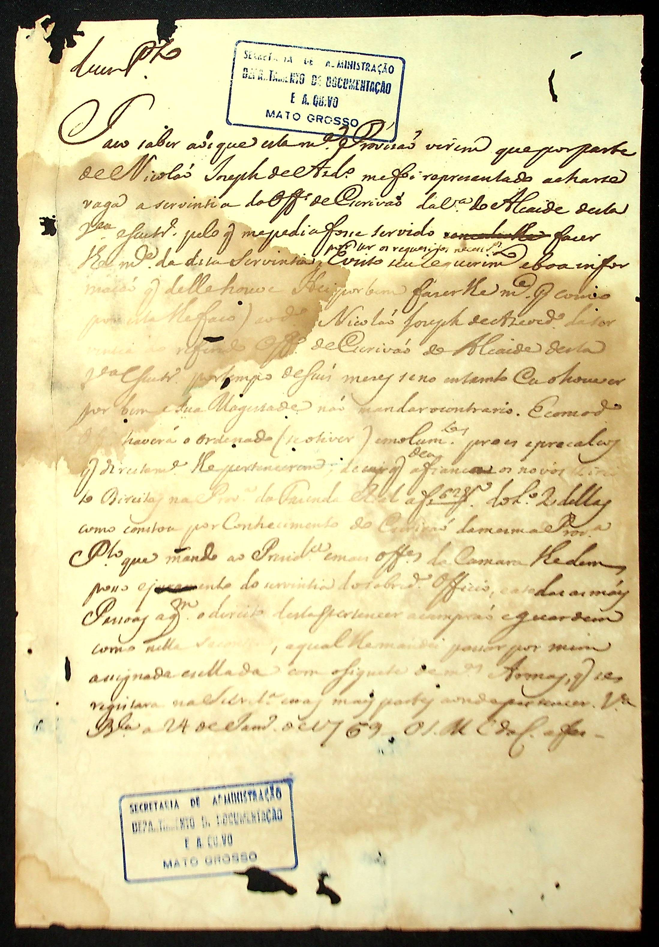 PROVISÃO do Governador e Capitão-General da Capitania de Mato Grosso Luís Pinto de Souza Coutinho Nomeando Nicolau Jose de Azevedo, Escrivão da Vara de Alcaide de Vila Bela.