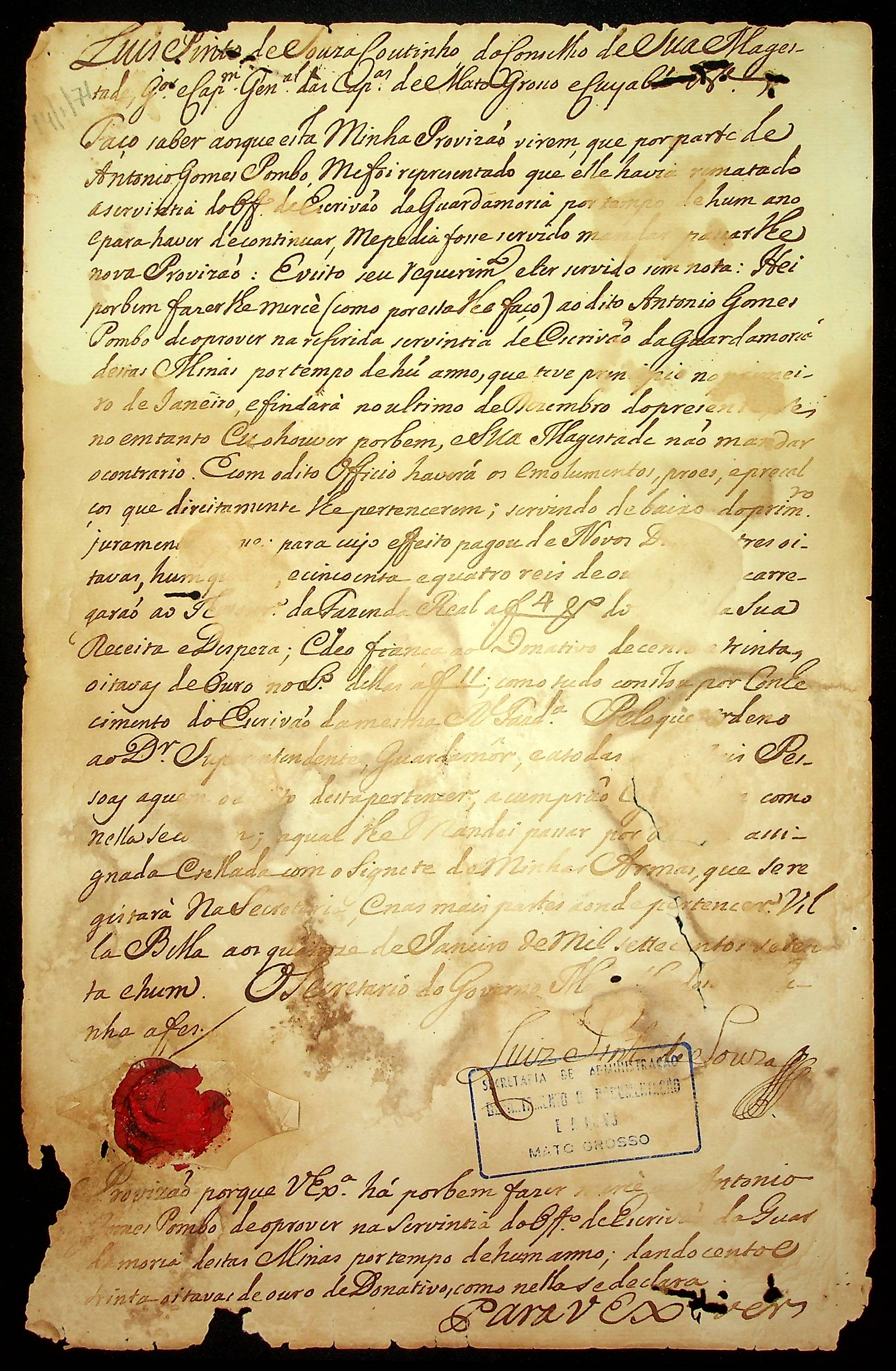 PROVISÃO do Governador e Capitão-General da Capitania de Mato Grosso Luiz Pinto de Souza Coutinho que prove Antônio Gomes Pombo ao cargo de Escrivão da Guardamoria.