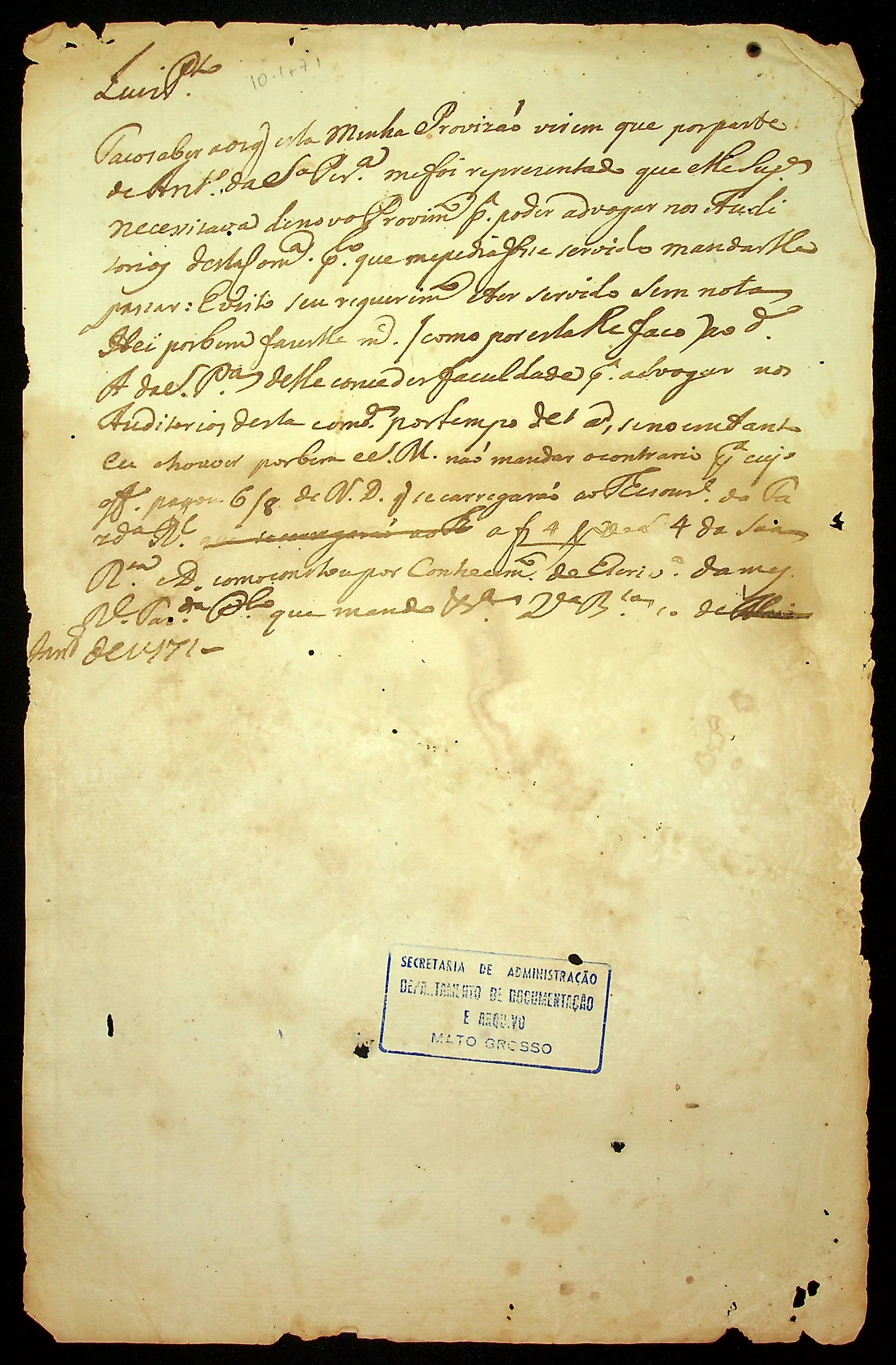 PROVISÃO do Governador e Capitão-General da Capitania de Mato Grosso Luís Pinto de Souza Coutinho que prove a Antônio da Silva Pereira o direito de advogar nos auditórios da Comarca de Vila Bela.