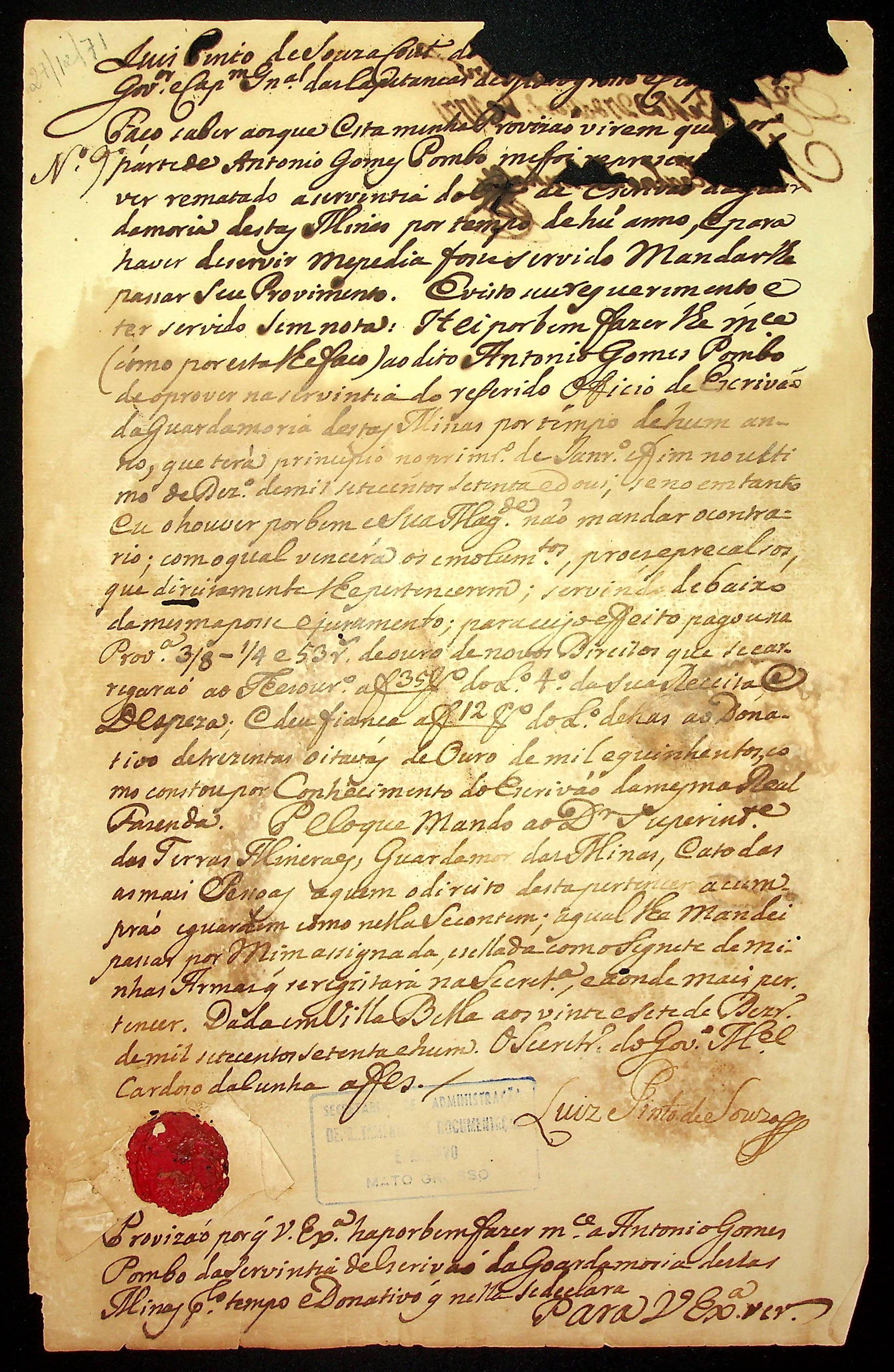 PROVISÃO do Governador e Capitão-General da Capitania de Mato Grosso Luís Pinto de Souza Coutinho em que nomeia Antônio Gomes Pombo da serventia Escrivão da Guardamoria das minas.