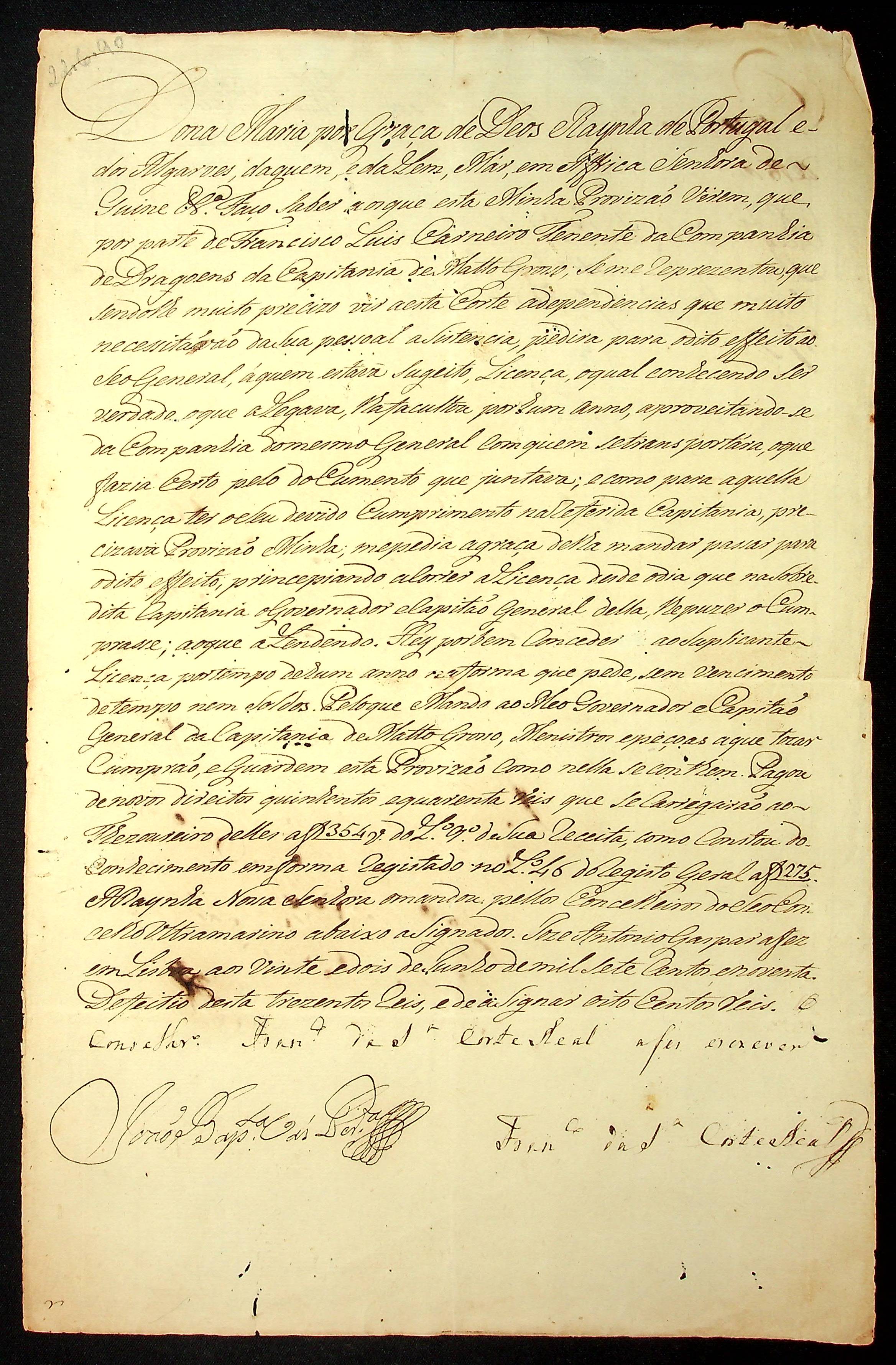 PROVISÃO da Rainha Maria concedendo a licença ao Tenente da Companhia de Dragões da Capitania de Mato Grosso Francisco Luiz Carneiro.