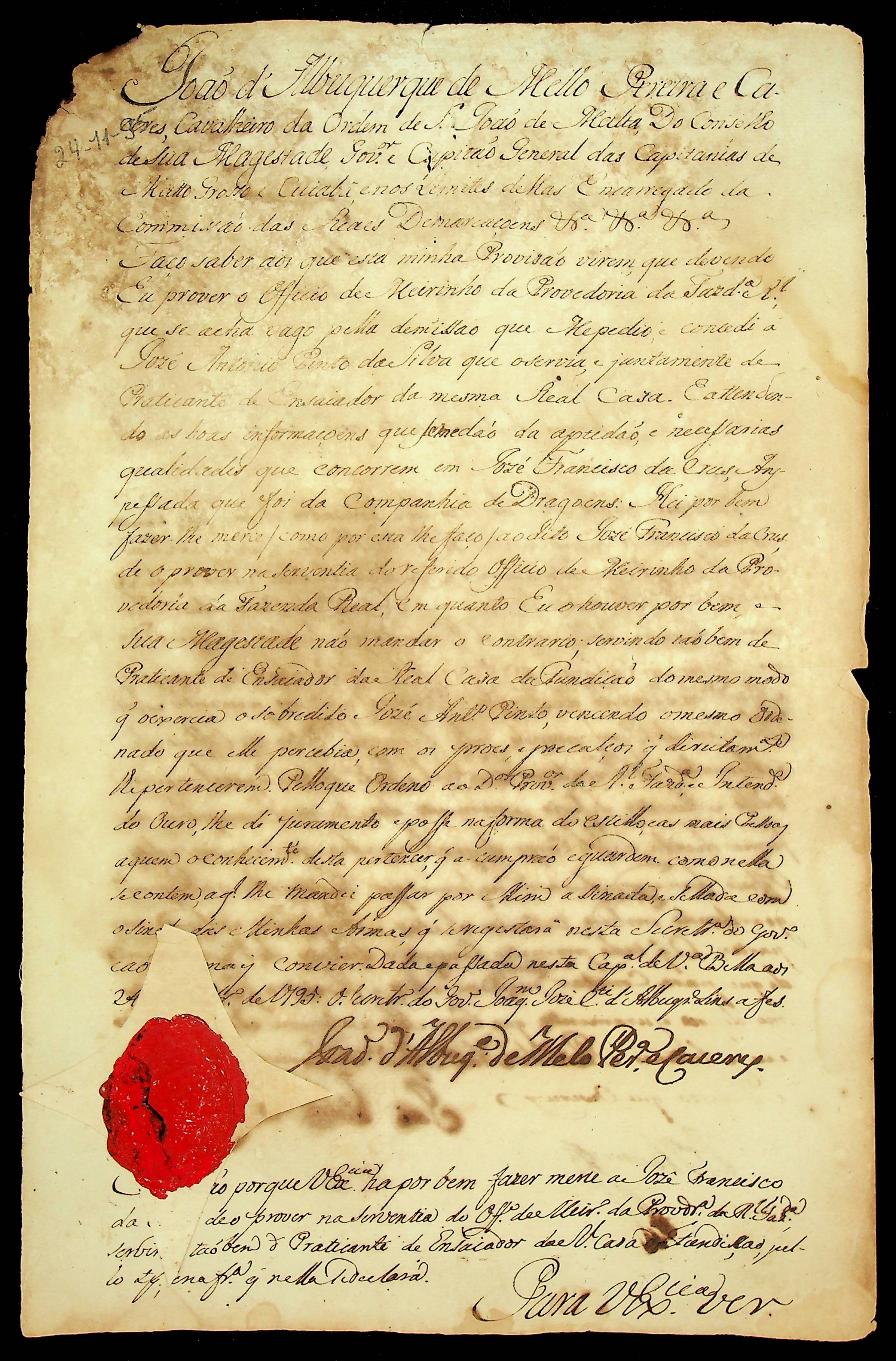 PROVISÃO do Governador e Capitão-General João de Albuquerque de Melo Pereira e Cáceres nomeando José Francisco da Cruz para o Ofício de Meirinho da Fazenda Real.