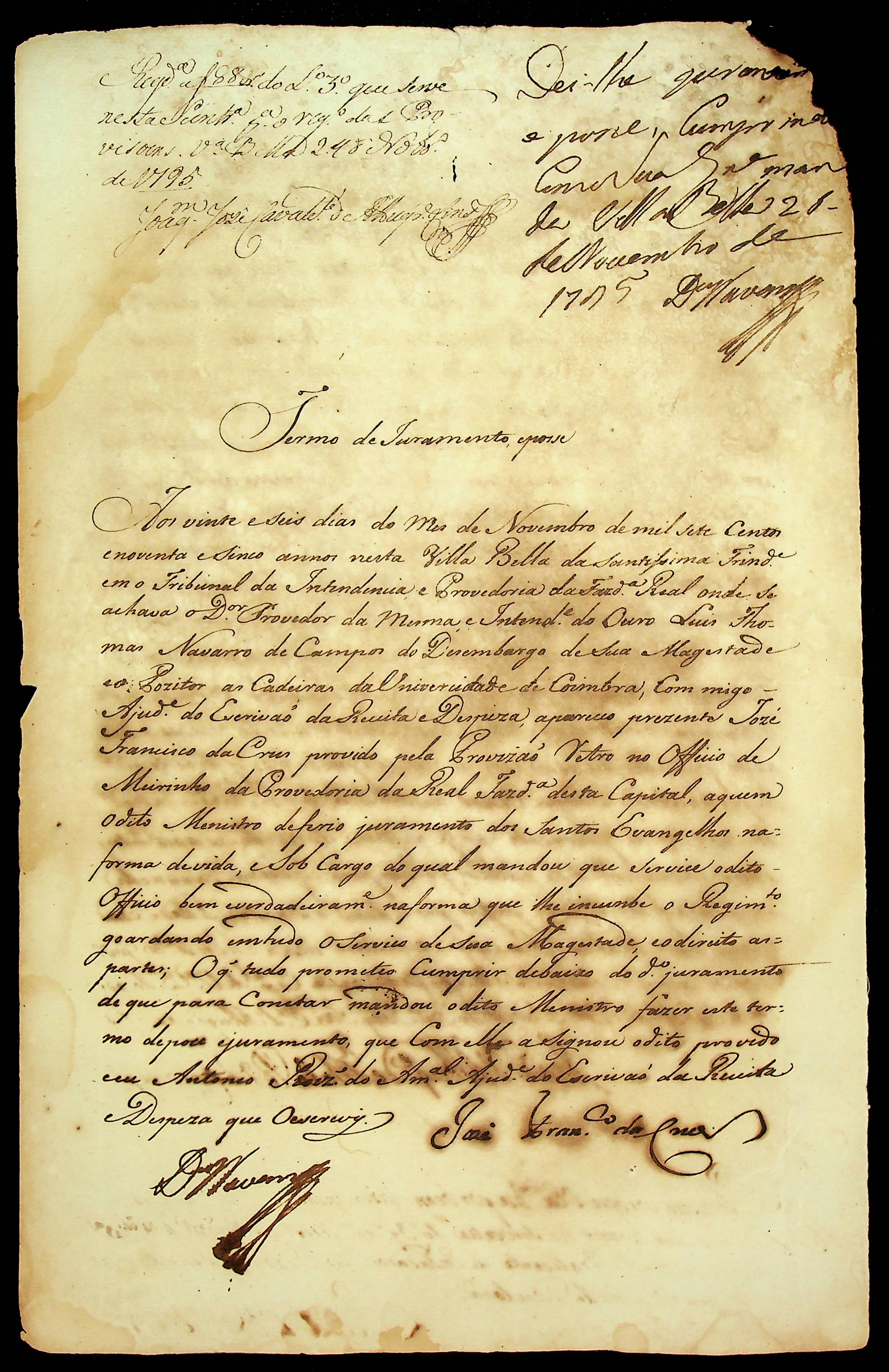 PROVISÃO do Governador e Capitão-General João de Albuquerque de Melo Pereira e Cáceres nomeando José Francisco da Cruz para o Ofício de Meirinho da Fazenda Real.