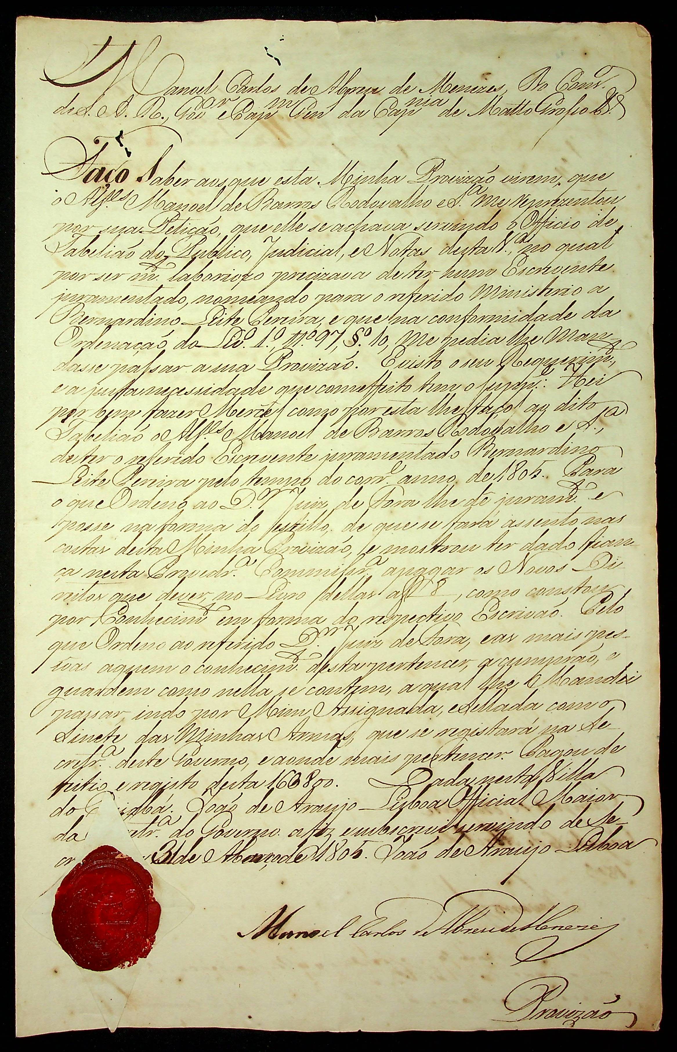 PROVISÃO à Bernardino Leite Pereira expedida pelo Governador e Capitão-General da Capitania de Mato Grosso Manoel Carlos de Abreu e Menezes nomeando para o Cargo de Escrevente.