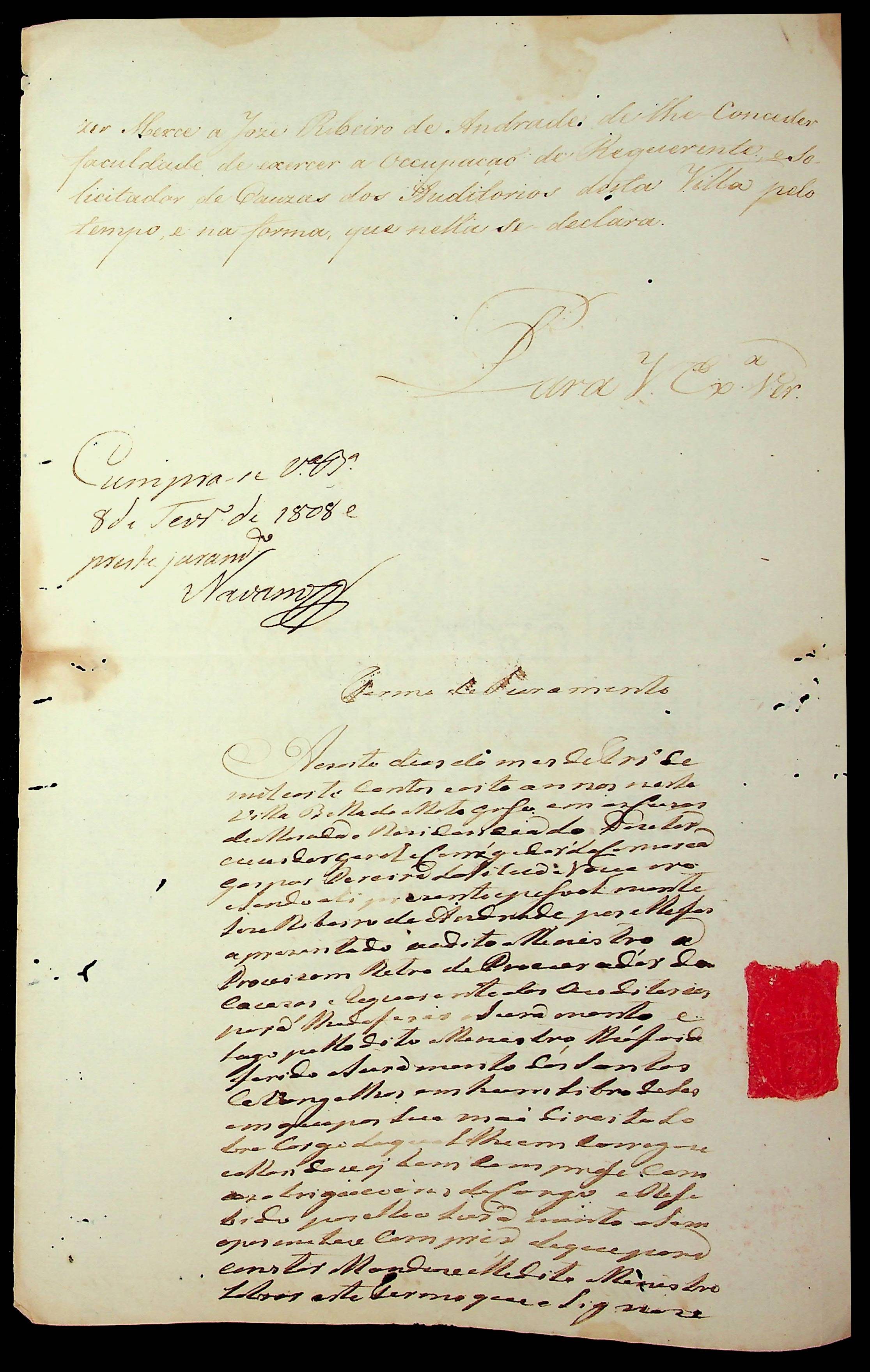 PROVISÃO expedida pelo [Governador e Capitão-General da Capitania de Mato Grosso] João Carlos Augusto d´ Oeynhausen e Gravemberg informando sobre a petição de José Ribeiro de Andrade para exercer o cargo de Requerente e solicitador de causas dos auditórios de Vila Bela.