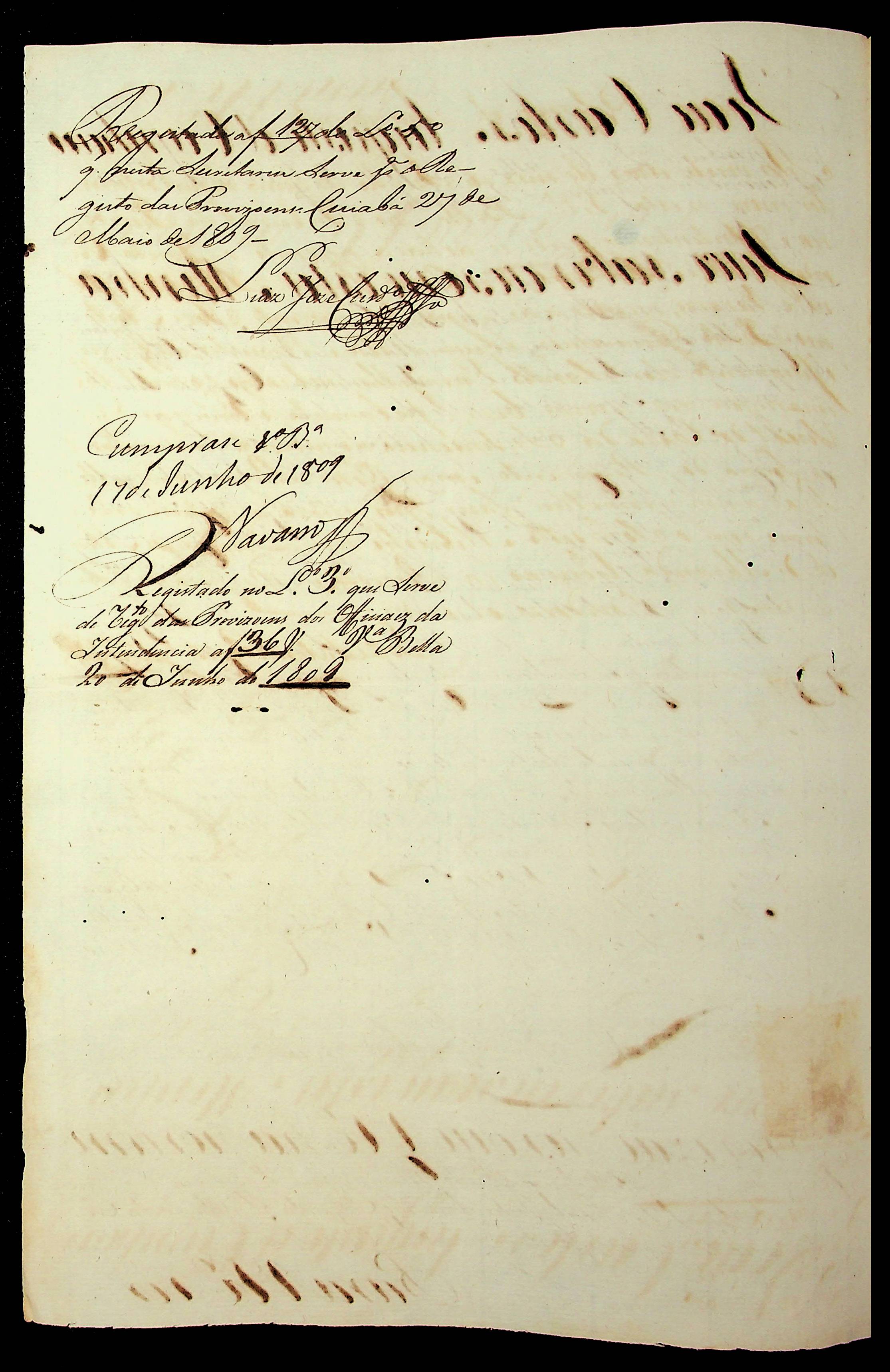 PROVISÃO expedida pelo Governador e Capitão-General da Capitania de Mato Grosso João Carlos Augusto de Oyenhausen e Gravemberg nomeando José Antônio Pinto Guimarães para Fiscal da Real Intendência e Casa de Fundição.