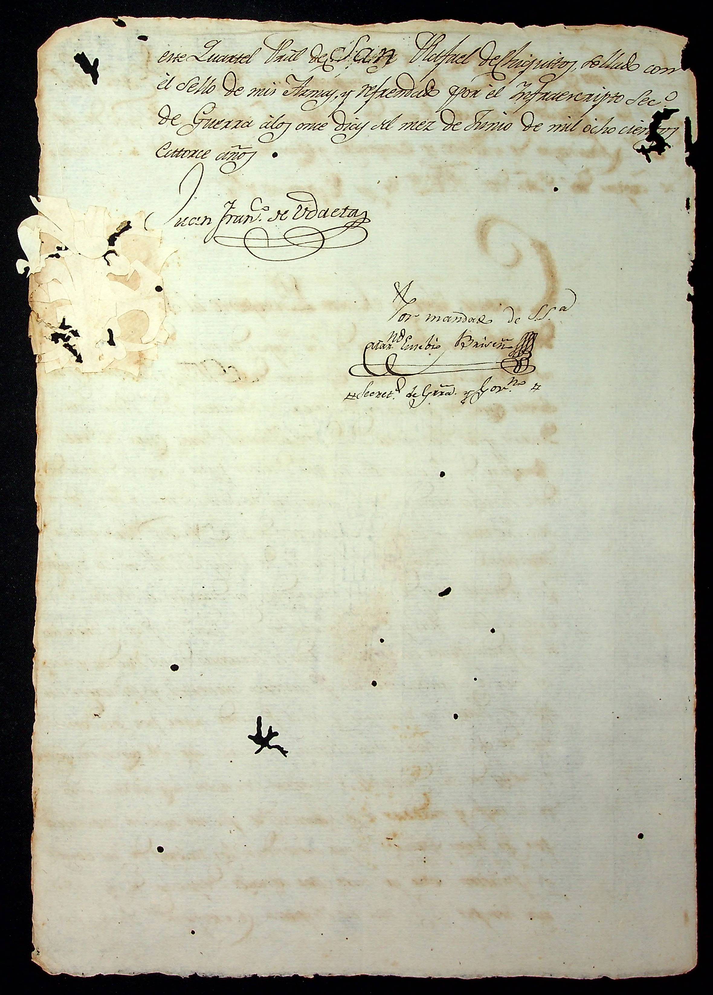 PASSAPORTE passado pelo Tenente Coronel Governador de Santa Cruz de la Sierra Juan Francisco Vdaeta, autorizando a passagem de militares.