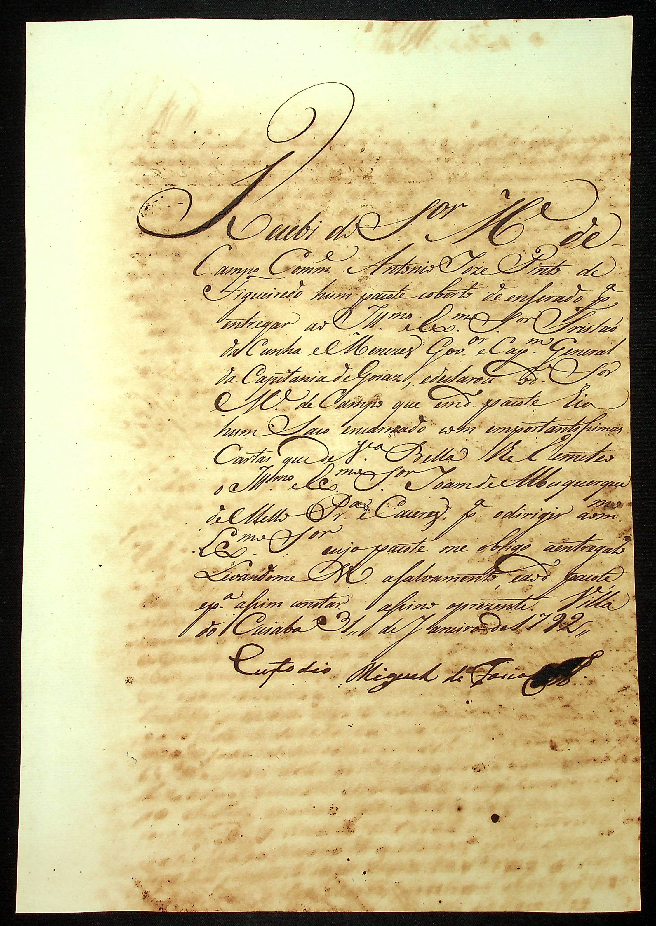 RECIBO expedido por Custódio Miguel de Farias, atestando o recebimento de um pacote de cartas das mãos do Mestre de Campo Antônio José Pinto de Figueiredo.