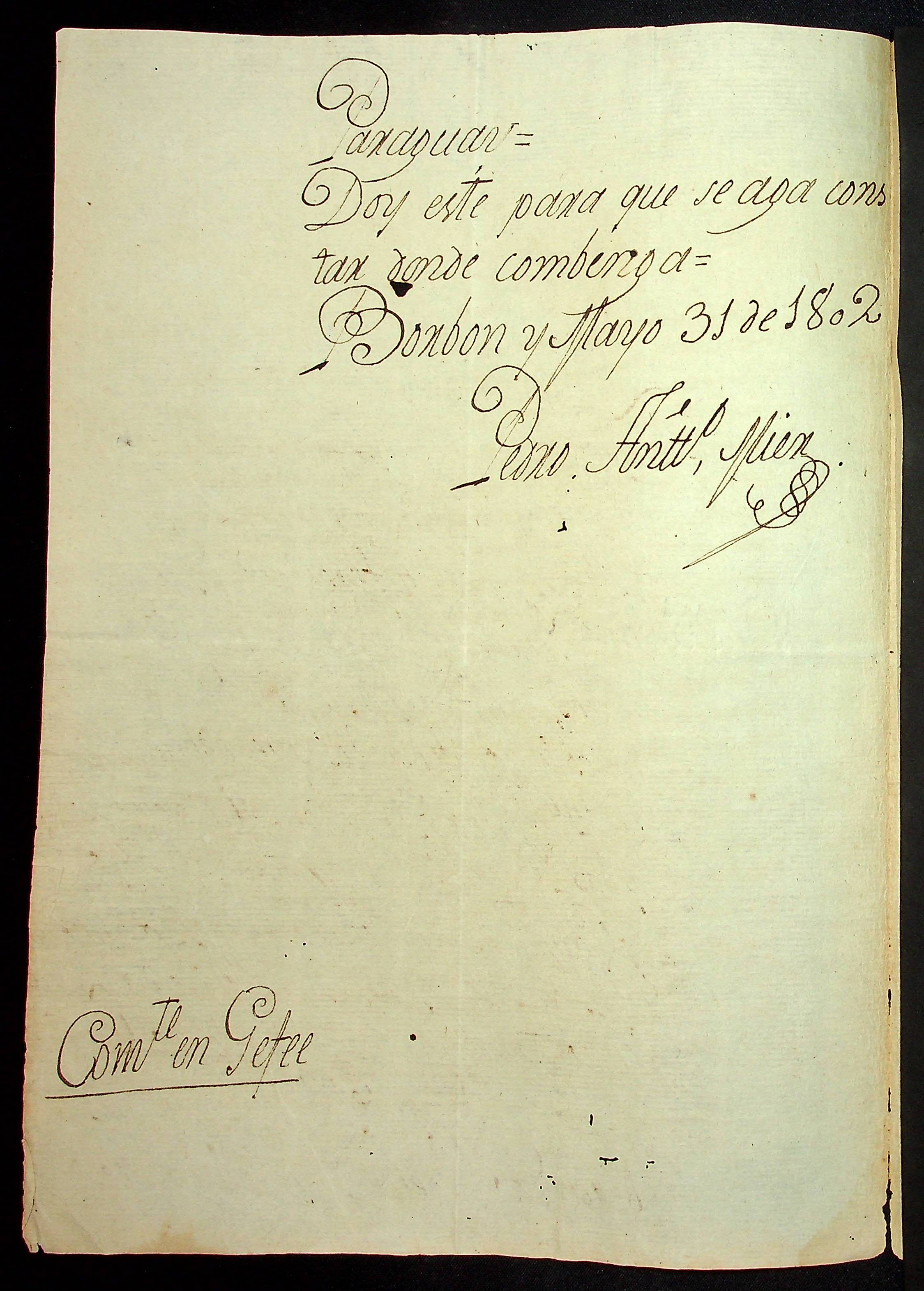 RECIBO do Comandante de Bourbon Pedro Antônio Miens ao Capitão [Manoel Veloso] e o Alferes [Antônio José do Rosário].